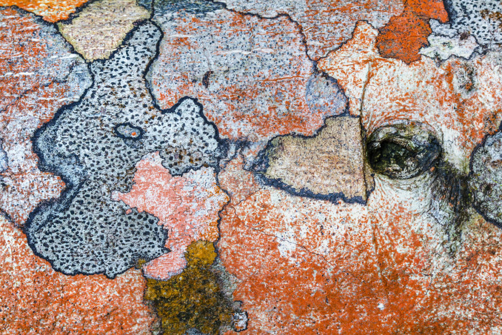 Ein von Flechten überzogener Berghang auf schwarzem Lavagestein. Die Flechten leuchten in herbstlichen Rot und Gelb, wirken wie ein Teppich, der den Hang überzieht, unterbrochen von einigen vertikalen Erosionsrinnen.