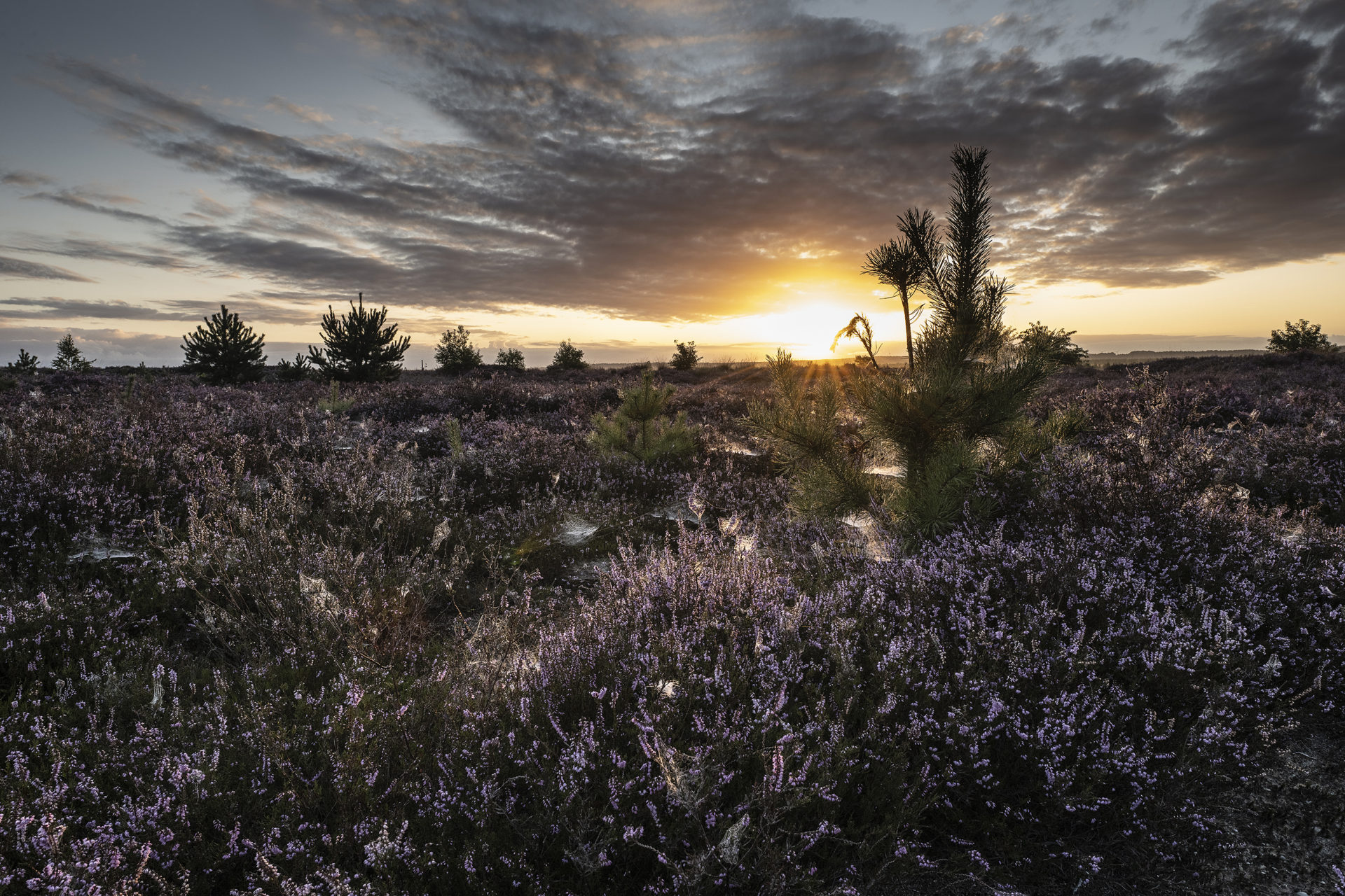 Die aufgehende Sonne beleuchtet die Spinnennetze im Heidekraut