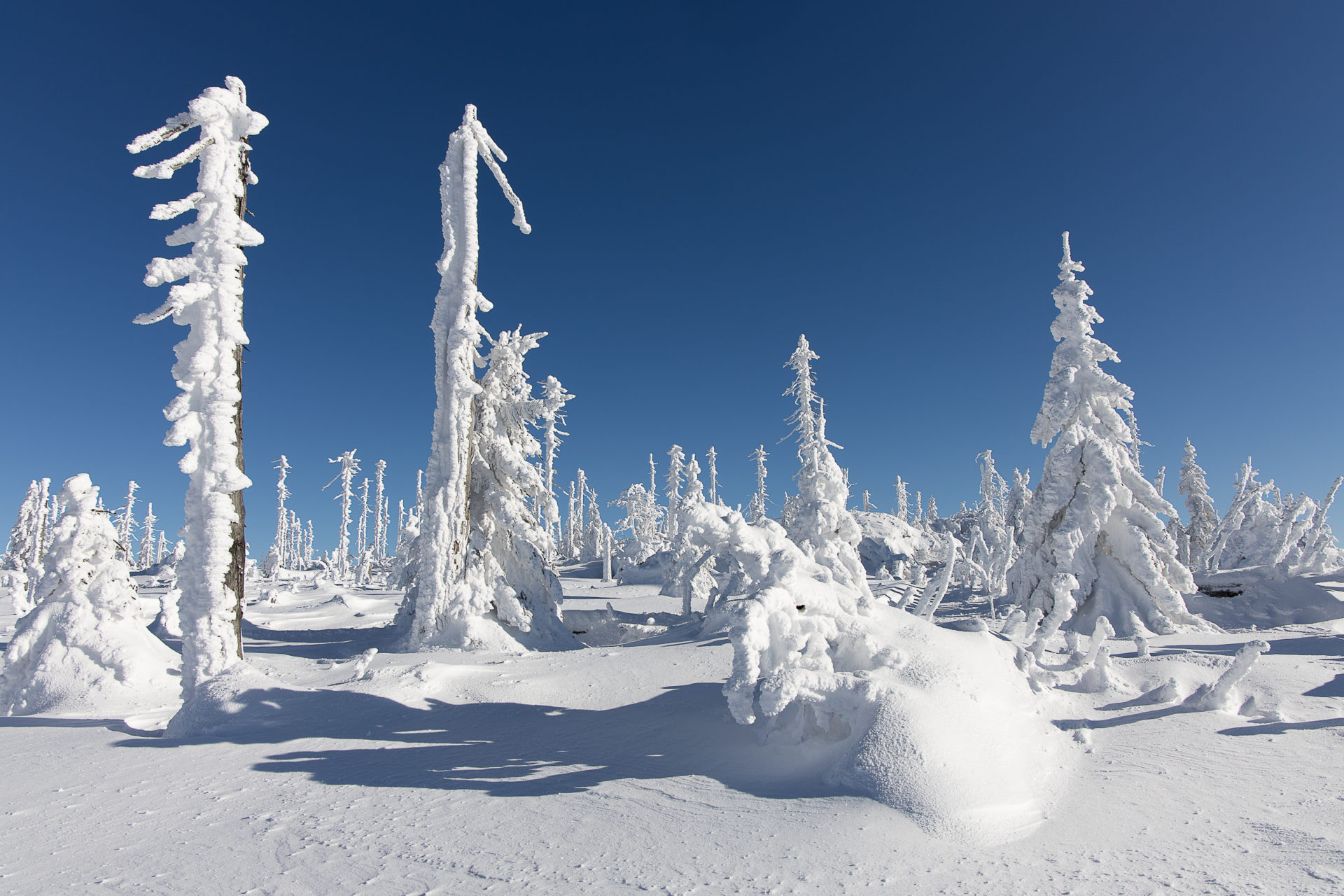 Das Fußbergmoos ist der Überrest eines einst großen Niedermoores. Durch den Schnee auf den Feuchtwiesen wird das Weiß der Birkenrinde in anderen Bereichen des Motivs wiederholt.