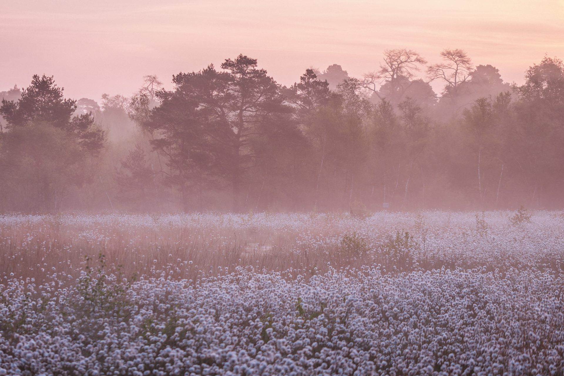 Noch vor Sonnenaufgang zeigte sich die Wollgrasblüte im Moor in einer wunderschönen Stimmung. Ein leichter Bodennebel verzauberte die Szene. Der Beginn eines perfekten Morgens.