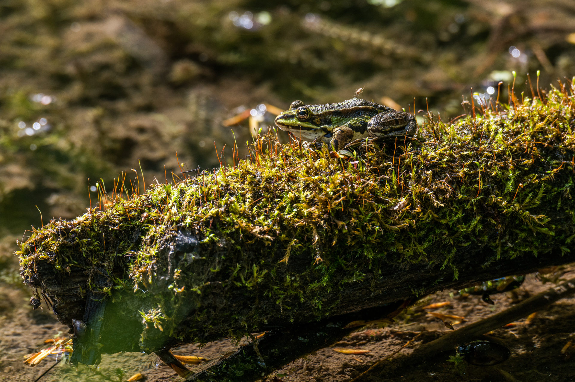 Was macht man an einem heißen Junitag? Genau – man sucht sich kühles Nass, bevorzugt einen einsamen Bach mit schattigem Blätterdach. Als ich bewaffnet mit meinem 200er F2.8 auf der Suche nach schön sitzenden Libellen durch das Wasser watete, habe ich versehentlich diesen Frosch aus der Deckung des Uferbereiches getrieben. Er verweilte für kurze Zeit in einem seichten Teil mitten im Bach und beäugte mich kritisch. Das war meine Gelegenheit vom Ufer aus einige Portraits auf Augenhöhe zu schießen. Das Blätterdach spiegelt sich dabei in den kleinen Wellen des dahinplätschernden Baches.