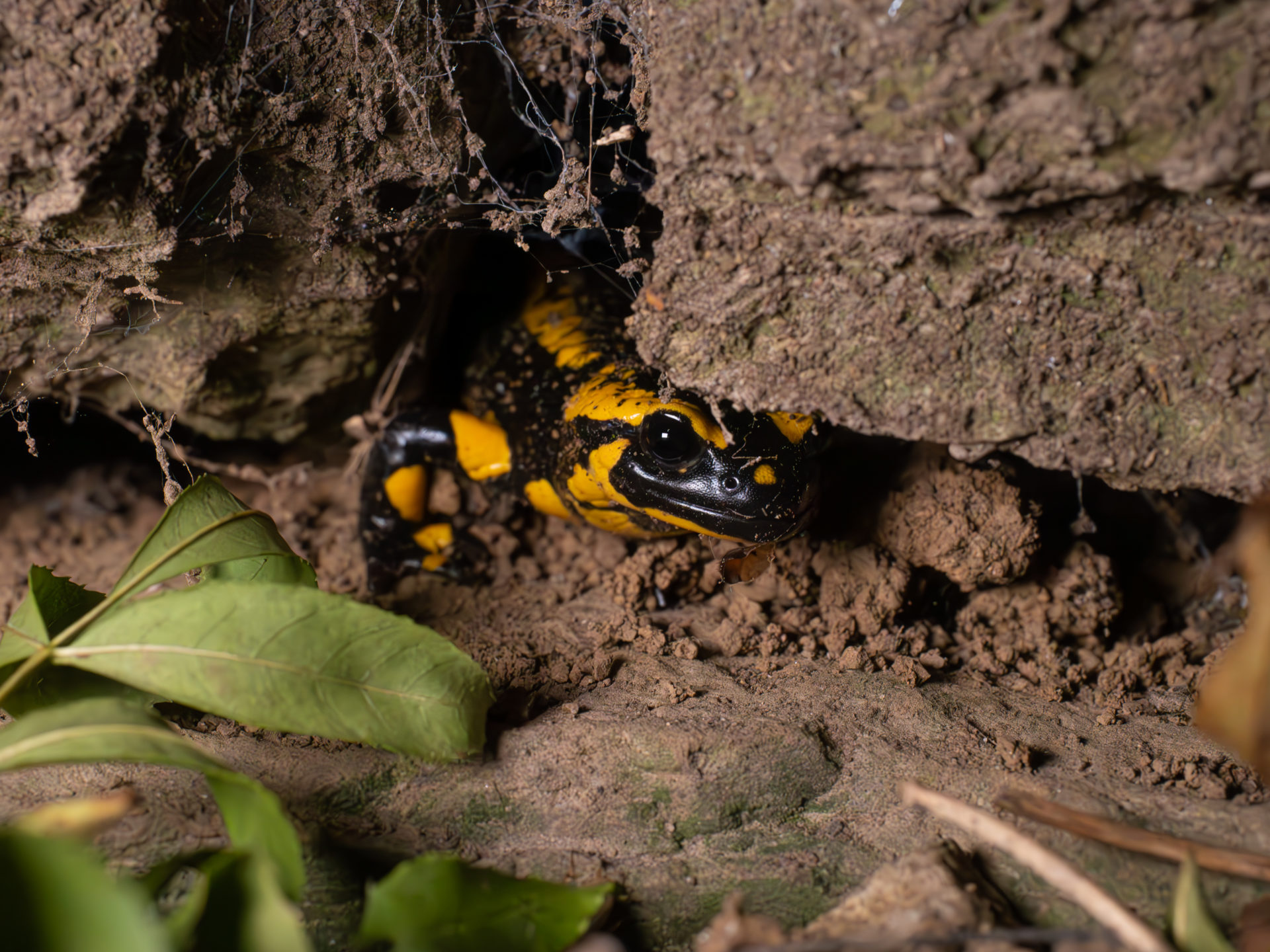 Das Bild zeigt einen lebhaften Feuersalamander, der neugierig aus einer Steinmauer herausblickt. Nach einem regnerischen Tag am Spätabend reflektiert die feuchte Umgebung das sanfte Licht der Dämmerung. Die charakteristischen schwarz-gelben Farbmuster des Salamanders leuchten lebhaft und ziehen die Aufmerksamkeit auf sich. Die Details der Hauttextur und die eindrucksvolle Farbgebung machen den Feuersalamander zu einem faszinierenden Motiv, das die Schönheit und Fragilität der Natur einfängt.