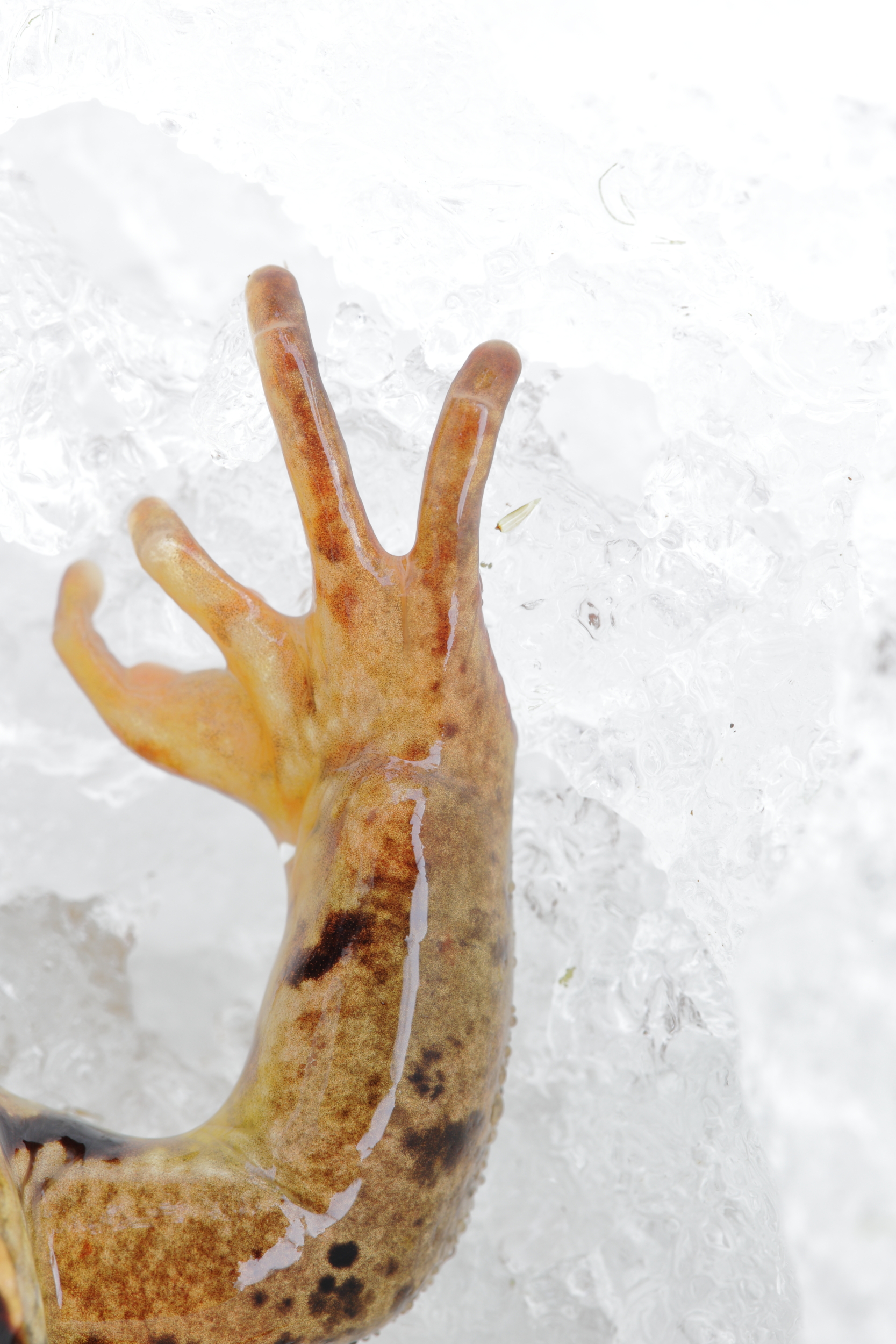 An einem vereisten Wasserfall in den bayerischen Alpen,entdeckte ich eine Kröte in Winterruhe(Kältestarre).Ich näherte mich ihr vorsichtig und konnte einige Detailaufnahmen machen.