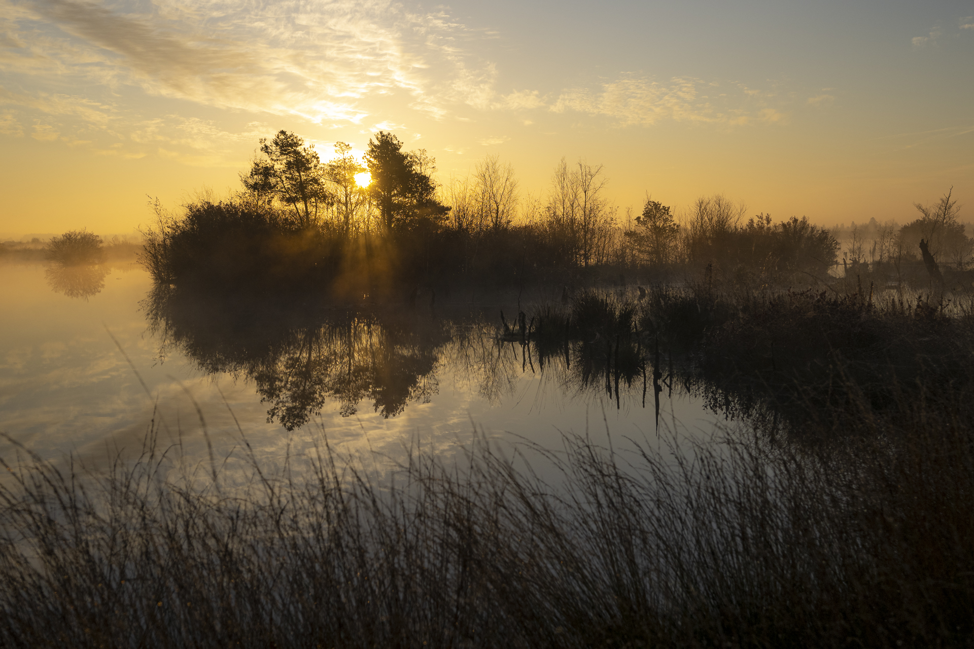 An diesem Bilderbuchmorgen waberte Nebel durch das Moor und streute sas Licht der aufgehenden Sonne. Zusammen mit der typischen Moorvegetation ein wunderschöner Moment. Diesen habe ich versucht festzuhalten.