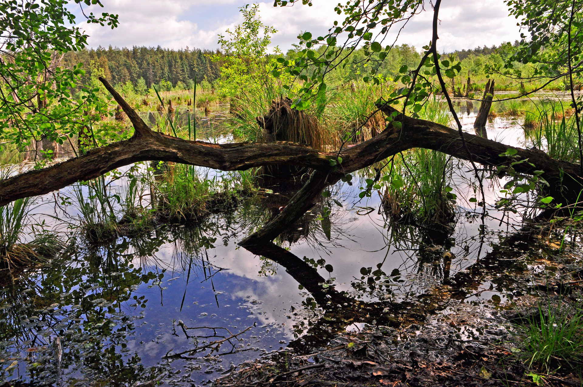 Bei einer Wanderung durch den Müritz-Nationalpark kamen wir auch zum Moor. Manchmal war es einfach nur matschig, aber an anderen Stellen stand alles unter Wasser. Schön waren die Spiegelungen im Wasser. Diese auf dem Foto hat mir am Besten gefallen .