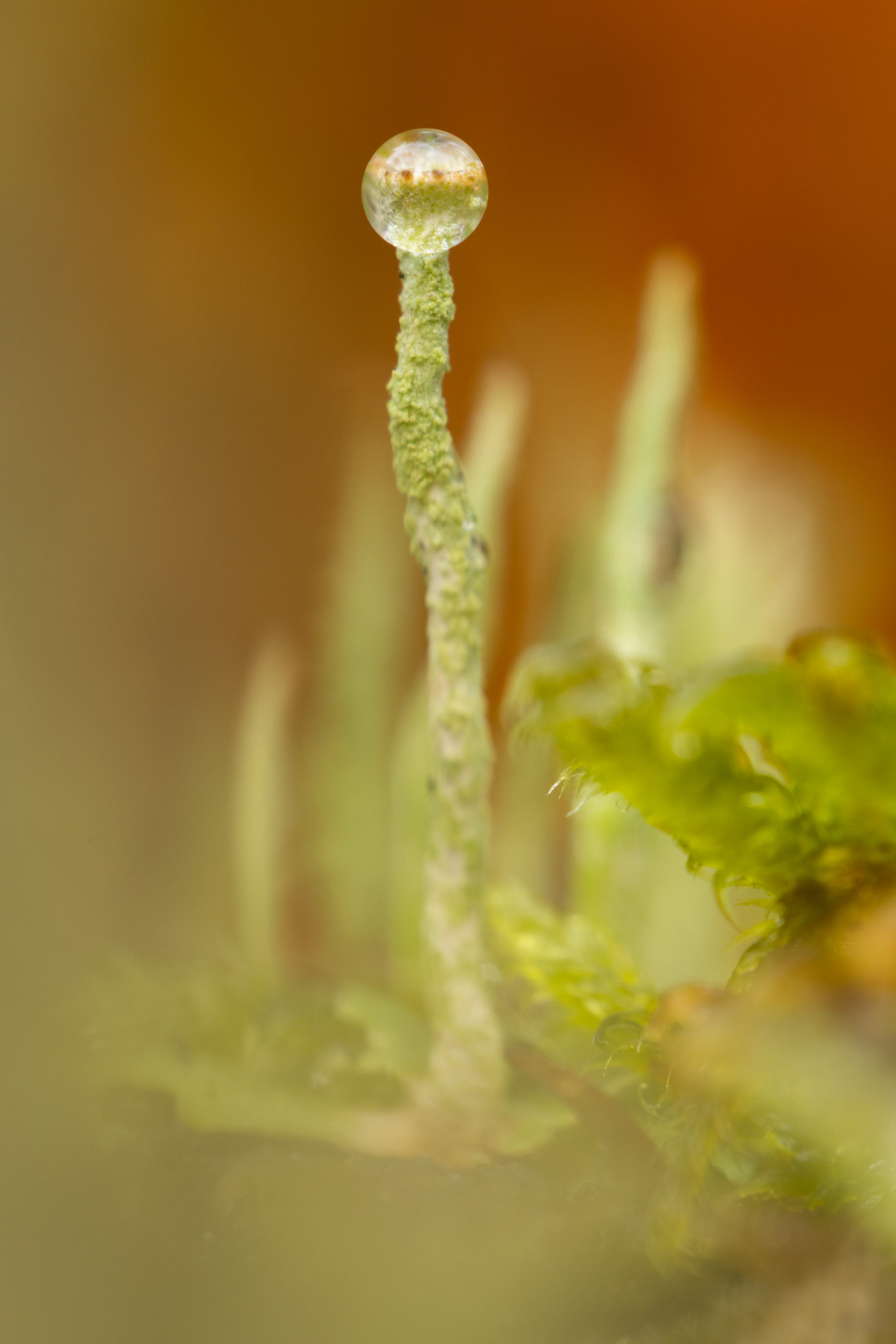 Mit einem 105mm Macroobjektiv und aufgeschraubtem Achromat habe ich nur auf die tropfenbedeckten Stängel der Moossporangien fokussiert