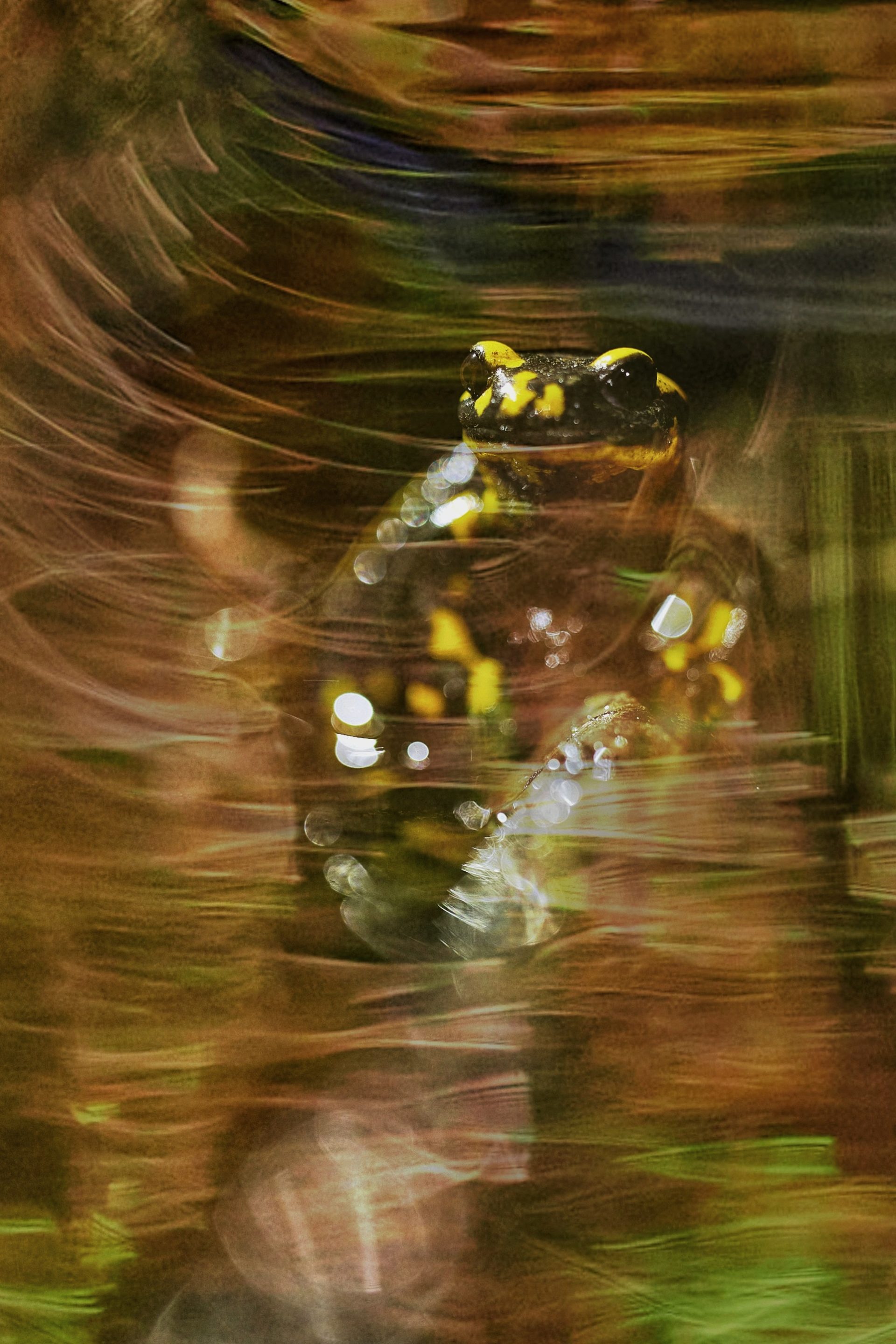 Salamander waren im Bach sehr aktiv. Einer der Salamander saß schon länger auf einem Ast im Wasser. Im Hintergrund sorgte die Unterschiede Sonne für ein tolles Bokeh. Das eingereichte Bild ist darüber hinaus eine Doppelbelichtung, um mehr Struktur ins Bild einzubauen.