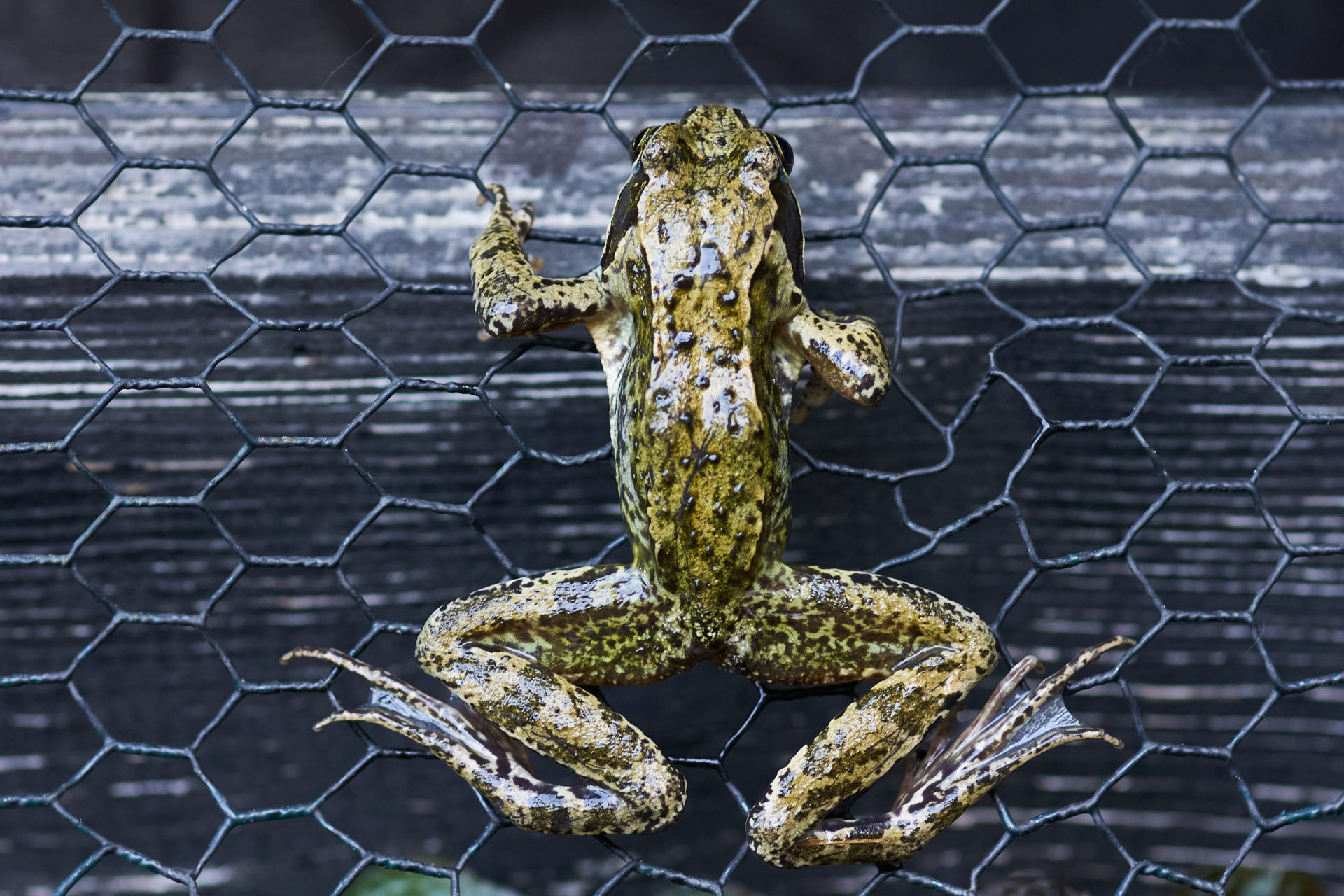 Barrierefreiheit – Fehlanzeige. Für diesen Grasfrosch war an diesem Maschendrahtzaun in einer Reihenhaussiedlung an meinem Wohnort erst ein Mal Endstation. Ich hoffte, dass er noch einen Durchschlupf fand und nicht „Spielzeug“ vieler freilaufender Katzen wurde. Aufnahmedaten: Sony DSLR-A700, Minolta Macro 100mm, f2,8 bei Blende 4, 1/60 Sek., ISO 800.