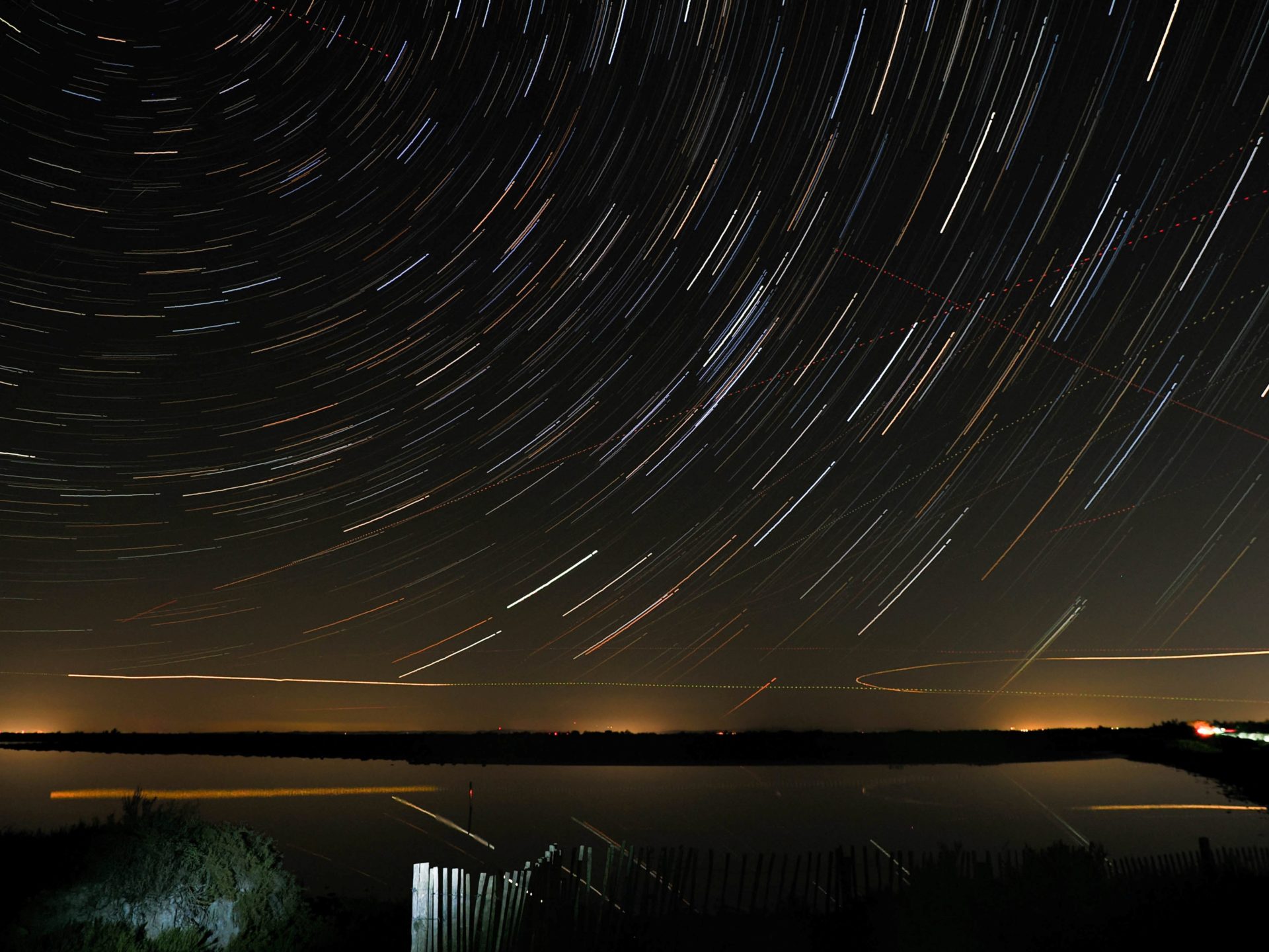 Die Sternenspuren am Nachthimmel über der Camargue werden durchkreuzt von gepunkteten Linien: Es sind die Flugzeuge, die in Marseille starten oder landen. Am Horizont leuchten die Raffinerien von Fos-sur-Mer, im Vordergrund öffnet sich der Etang de Fangassier.