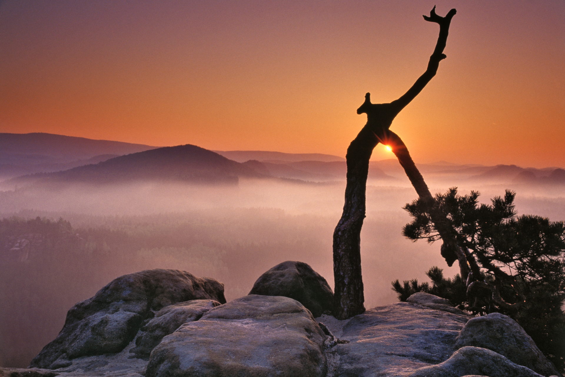 Im Elbsandsteingebirge gibt es einige sehr alte Kiefern. Sie wachsen direkt an den Felskanten. Da die Lebensbedingungen für die Bäume sehr hart sind, wachsen sie nur sehr langsam. Außerdem haben sie sehr bizarre Wuchsformen. Deshalb werden die alten Felskiefern auch Elbsandsteinbonzais genannt. In den letzten sehr warmen Jahren sind leider einige dieser besonderen Baumgestalten vertrocknet und abgestorben. Die abgebildete Kiefer thront aber weiterhin über den impossanten Sandsteinfelsen. Ich war schon viele Male bei den alten Baum. Aber an diesen Frühlingsmorgen waren die Bedingungen perfekt. Nach einen Wetterumschwung zogen Nebelschwaden durch das Tal. Ich versuchte mich auf der kleinen Felsspitze so zu postieren, dass ich die aufgehende Sonne als Sonnenstern in der Astgabel des alten Baumes abbilden konnte. Im ersten Morgenlicht ist mir so ein besonderes Foto von meinen Lieblingsbaum gelungen.