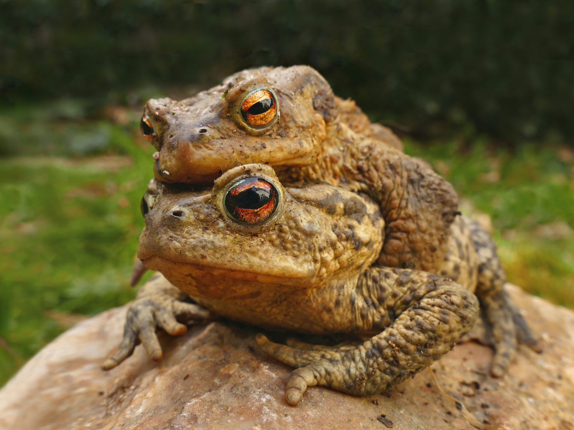 Das „Paar-Foto“ entstand im heimischen Garten in einer schattigen Ecke auf einem etwas größeren Stein. Dort befindet sich in der Nähe ein kleiner Gartenteich, wo ich durch Zufall diese Krötenpaar auf der „Durchreise“ entdeckte.