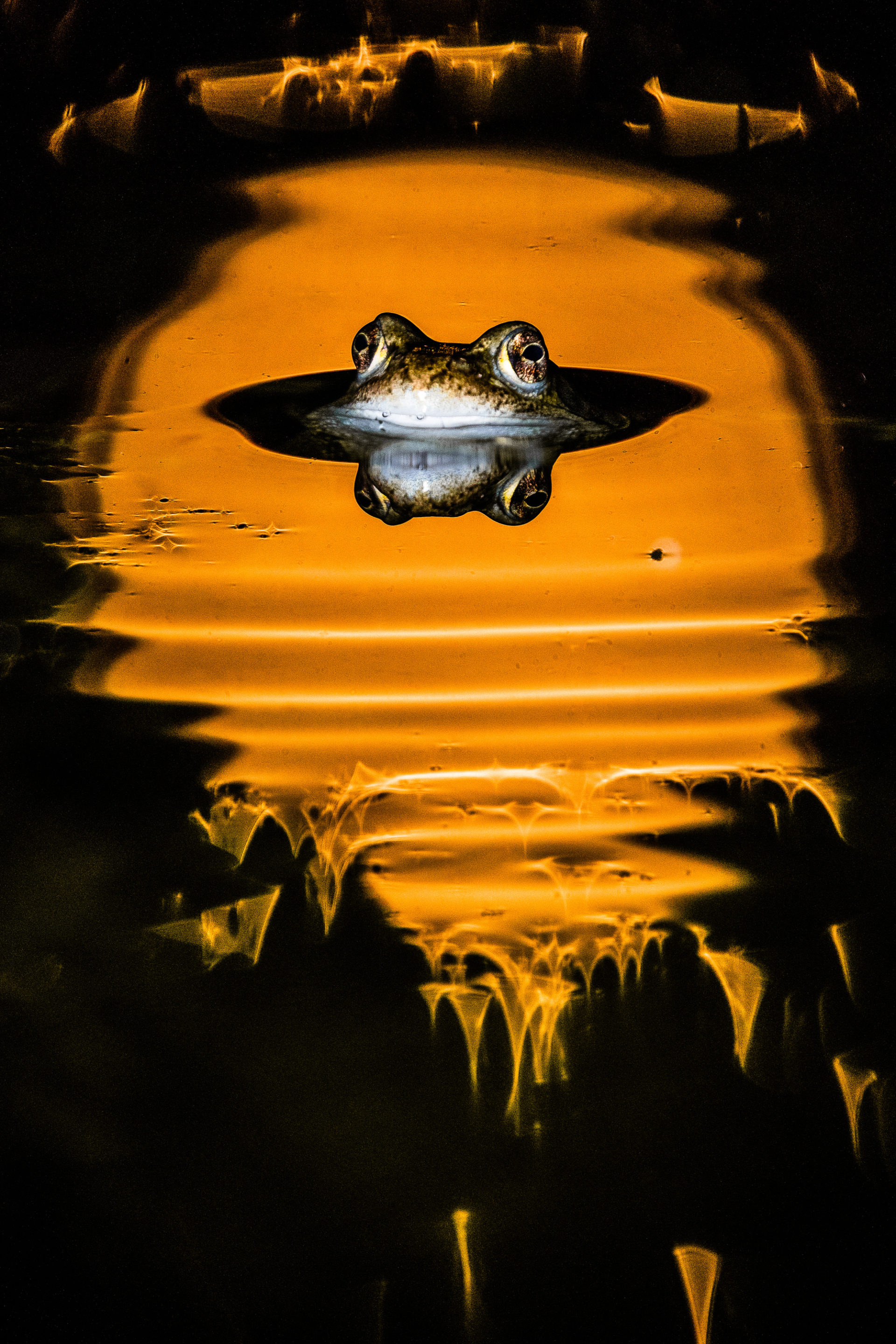 In den Abendstunden zeigen sich in unserem Gartenteich die Frösche und Molche. Ein Grasfrosch schaute aus dem Wasser und in tiefer Kameraposition spiegelte sich das Licht einer Straßenlaterne auf der Wasseroberfläche. Wassertropfen die vom Baum fielen erzeugten interessante Strukturen auf der Wasseroberfläche. Angestrahlt mit einer Taschenlampe und der Reflektion entstanden einige dieser Bilder.