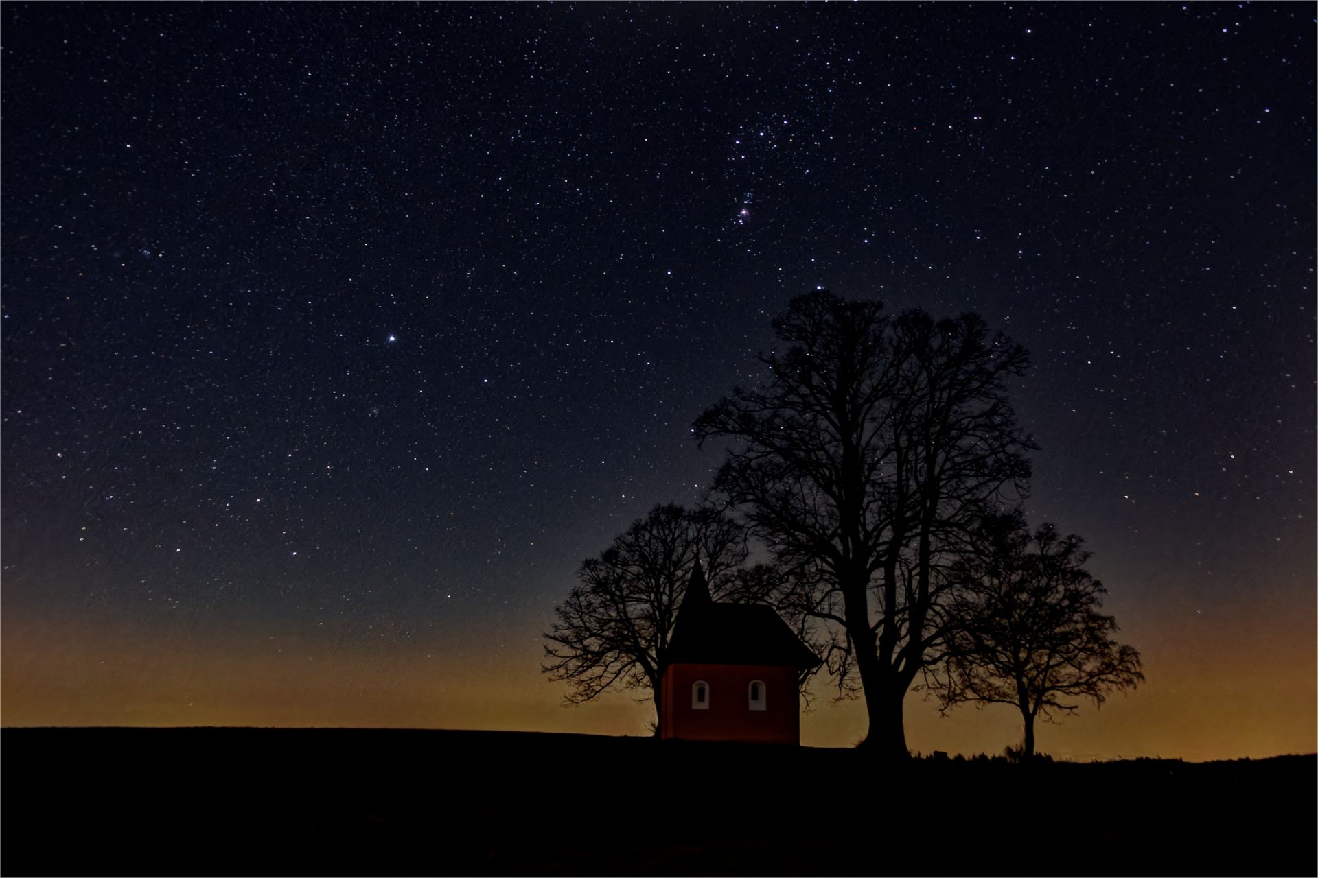 Sternenhimmel im März über der St. Anna Kapelle, der sog. „Roten Kapelle“ und der rd. 400 Jahre alten Hexenlinde (die 2021 leider einem Sturm zum Opfer gefallen ist) bei Friesenhagen im Wildenburger Land. Der Standort der Roten Kapelle war in der grausigen Zeit des Hexenwahns in der ersten Hälfte des 17. Jahrhunderts Schauplatz von über 200 Hinrichtungen und Hexenverbrennungen.
