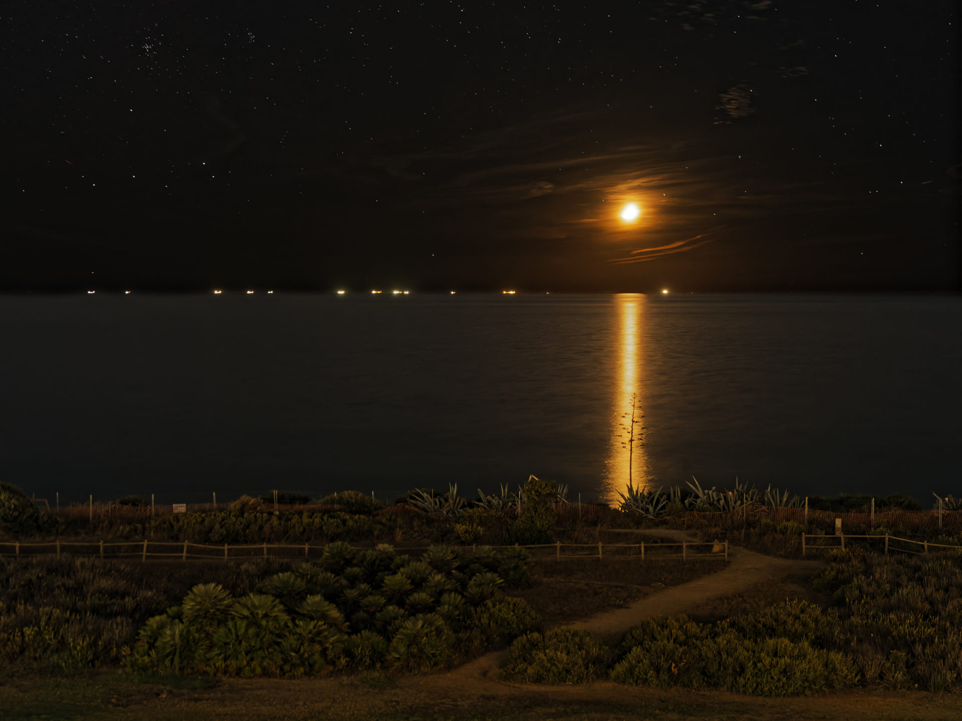 Der Mond stand über der Bucht von Cádiz und seine Lichtspur traf die Blüte einer Agave am Ufer. Die auf der Reede vor Cádiz liegenden Schiffe wie auch die auf dem Weg zwischen Gibraltar und Cap Sagres fahrenden Schiffe bilden eine Linie, die den Horizont unter dem Sternenhimmel markiert.