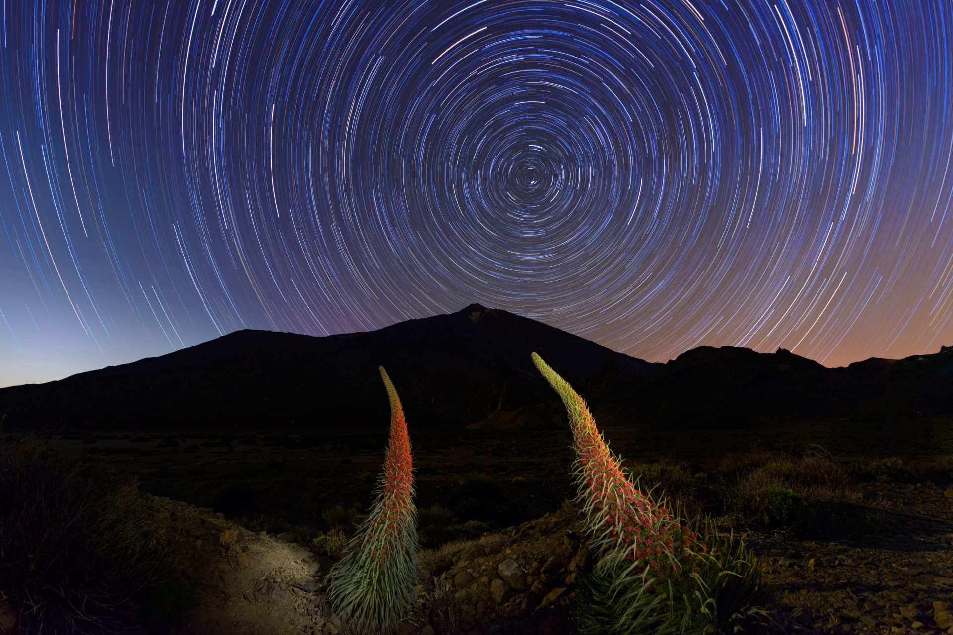 Das Bild zeigt zwei für Teneriffa typische Wildprets Natternköpfe vor dem Teide mit Blick Richtung Norden. Es ist zusammengesetzt aus einer Belichtung für den Vordergrund, beleuchtet mit einer Taschenlampe, und 18 Aufnahmen a 5 Minuten für den Sternenhimmel.