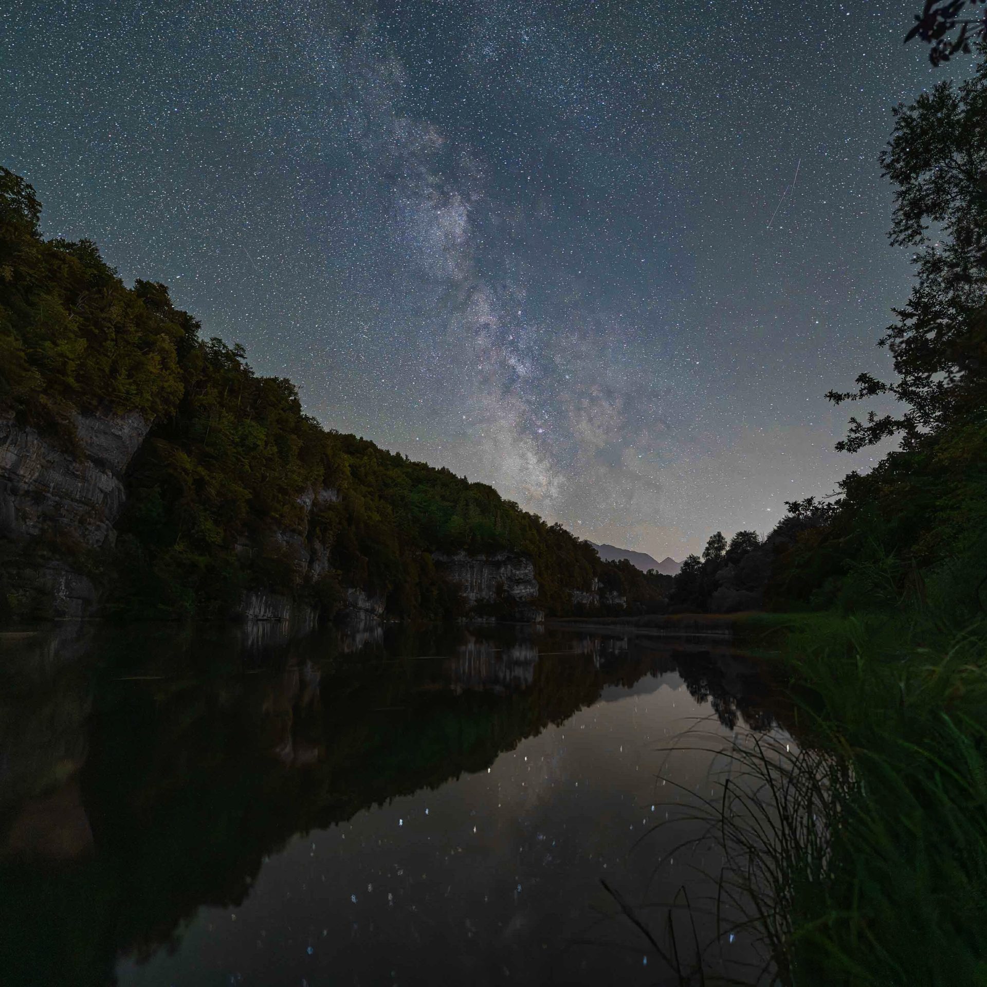 Der Wichelsee (Kt. Obwalden) liegt in einem Naturschutzgebiet das keine Wünsche offen lässt. In einer klaren Juninacht 2025 zeigt sich die Milchstrasse in klaren funkelnden Farben am dunklen Nachthimmel. Die Spiegelung der Sterne im glatten See verstärkt die magische Atmosphäre, während die Landschaft in gedämpftes Licht getaucht ist. Eine Stimmung die zum träumen einlädt.