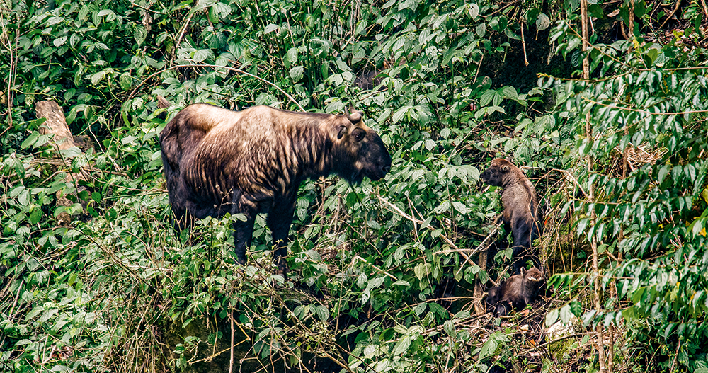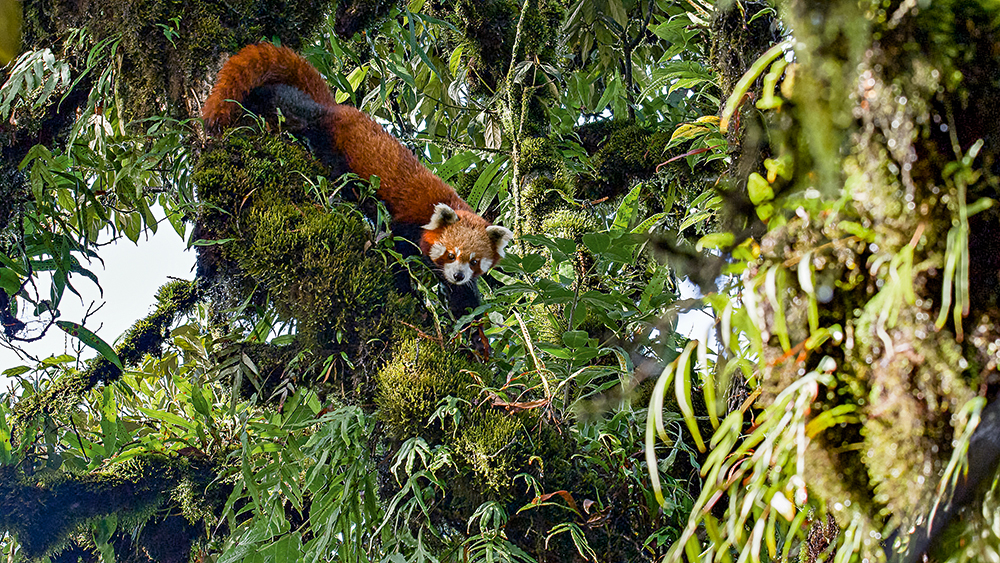 Das inhaltliche Problem bereiteten uns die Roten Pandas selbst. Sie sind ausgesprochen schwer in den unübersichtlichen Bambusdschungeln zu finden und sie verschlafen 70 Prozent des Tages. Mit Tieren, die Faultieren gleich so lange in Astgabeln oder auf gemütlichen Moospolstern hoch oben in Bäumen liegen, kann man keine aktionsreiche Monographie über Katzenbären drehen. Deshalb haben wir von vornherein Geschichten über andere Tierarten in das Drehbuch aufgenommen. So sind wir extra nach Bhutan geflogen, um Himalaya-Languren und Takine zu drehen. Königsglanzfasane, Satyr-Tragopane und Nektarvögel brachten Farbe in den Film und Etrusker-Spitzmäuse bisher nicht beobachtete Verhaltensweisen des kleinsten landlebenden Säugetiers.
