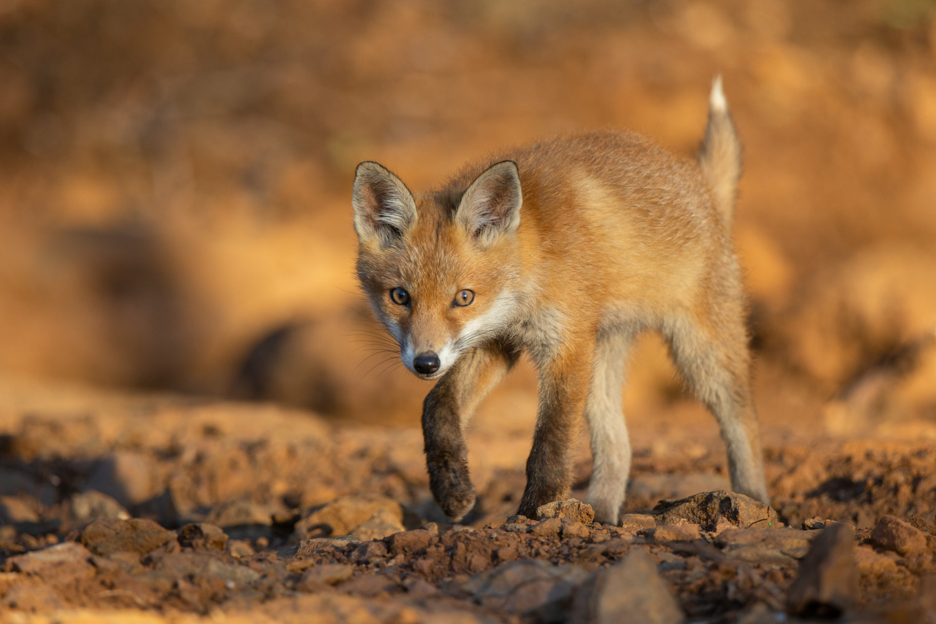 Die ehemaligen Eisenerz-Tagebaugebiete im Süden Luxemburgs beeindrucken mit ihrem charakteristischen rot-orangen Gestein. Am Fuß einer Abbauwand hatte eine Fuchsfamilie hier ihren Bau angelegt. Die Fellfarbe der Tiere passte so perfekt zur Umgebung, dass sie förmlich mit dem steinigen Untergrund verschmolzen.