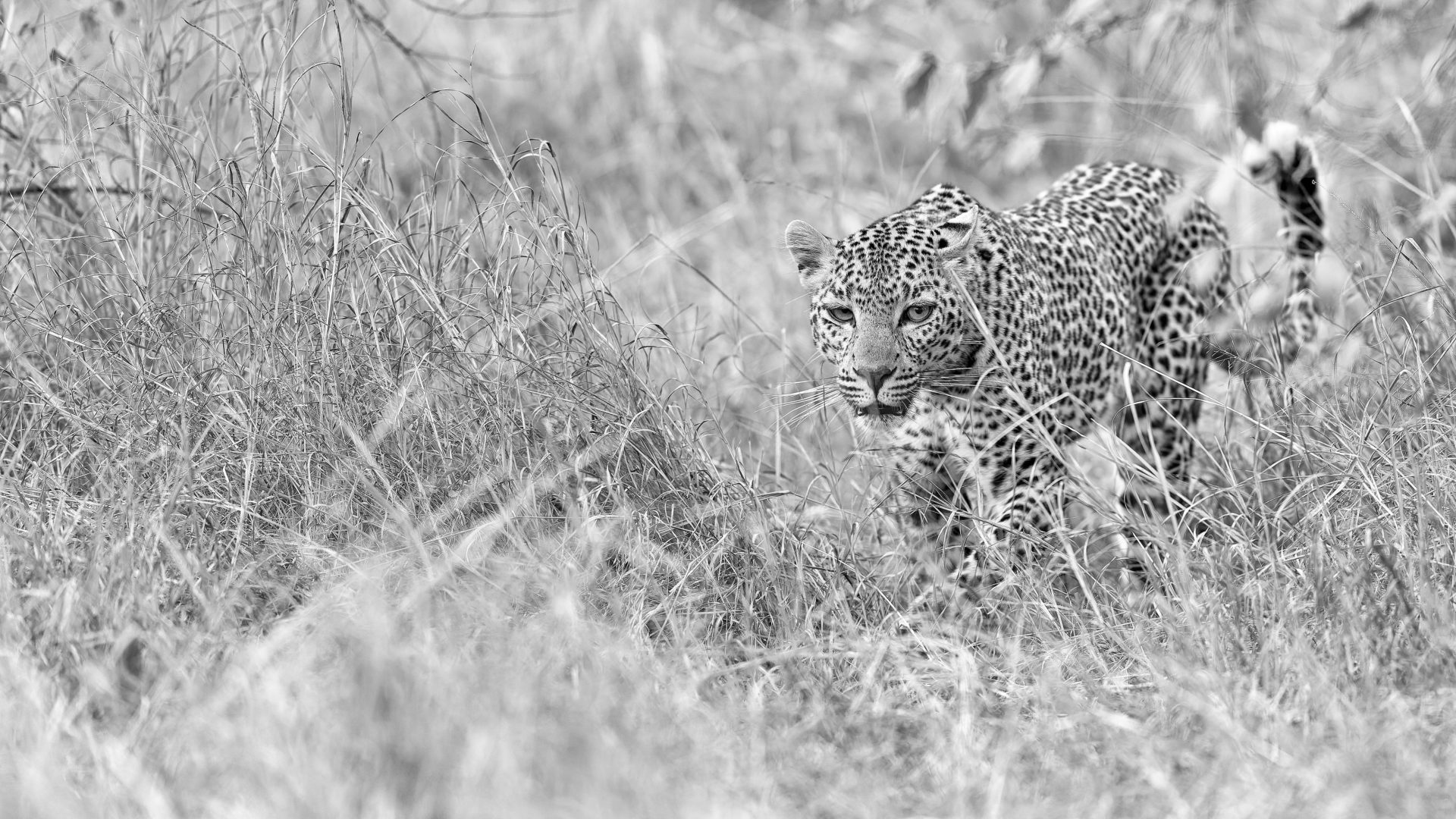 Eine Leopardin ist in der Dämmerung im hohen Gras der Masai Mara unterwegs.