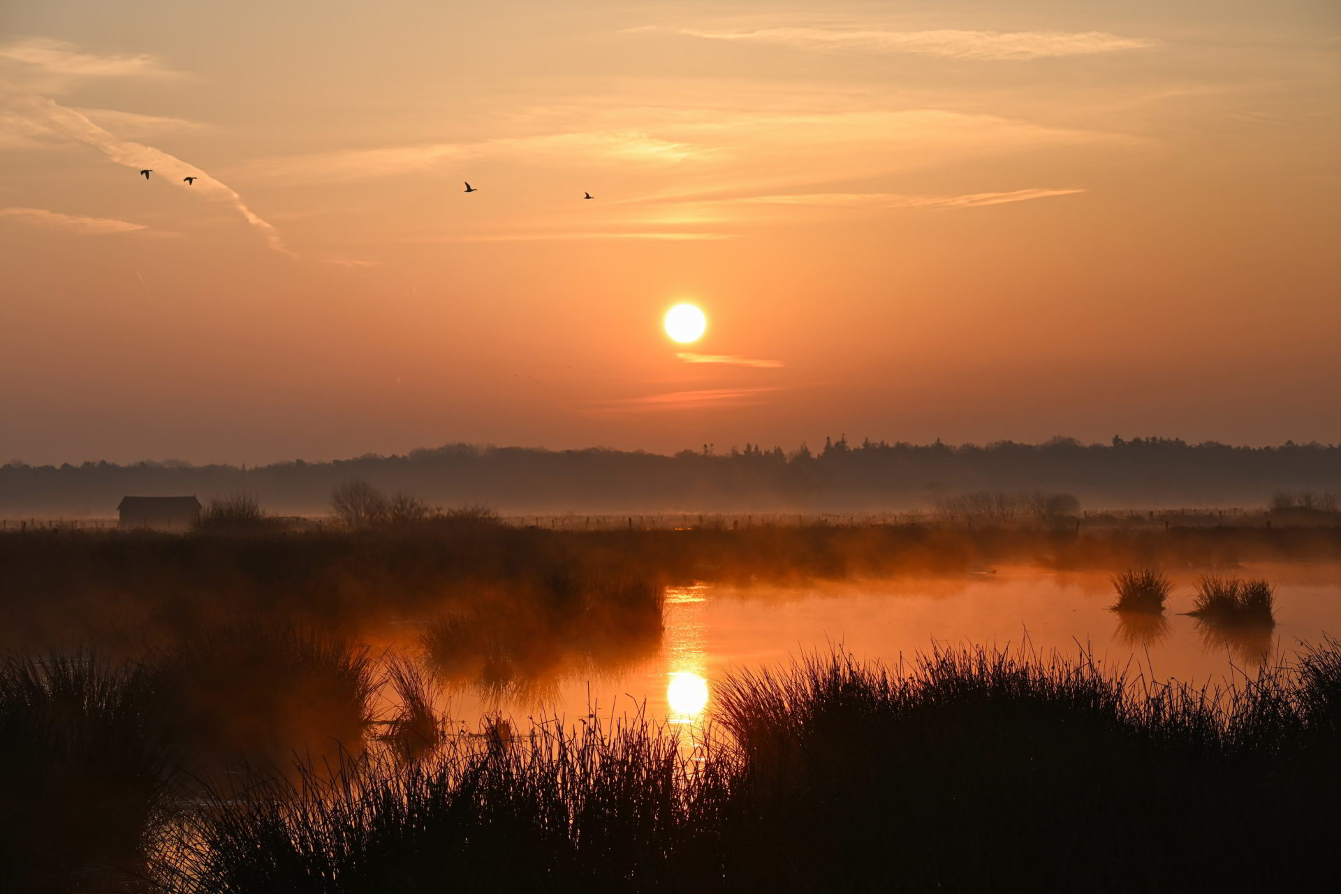 Einige Gänse fliegen bei Sonnenaufgang über nebeliges Moor.