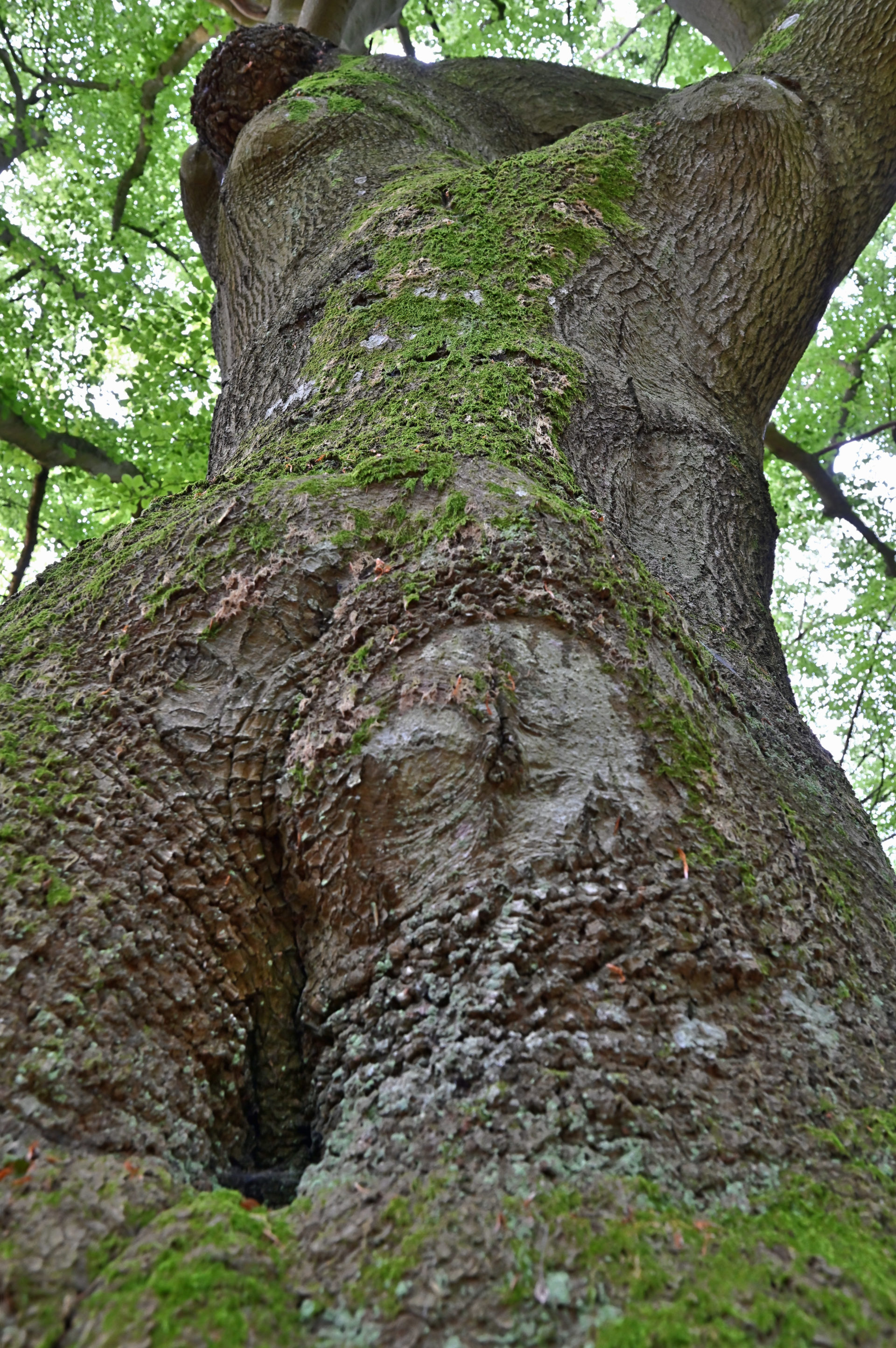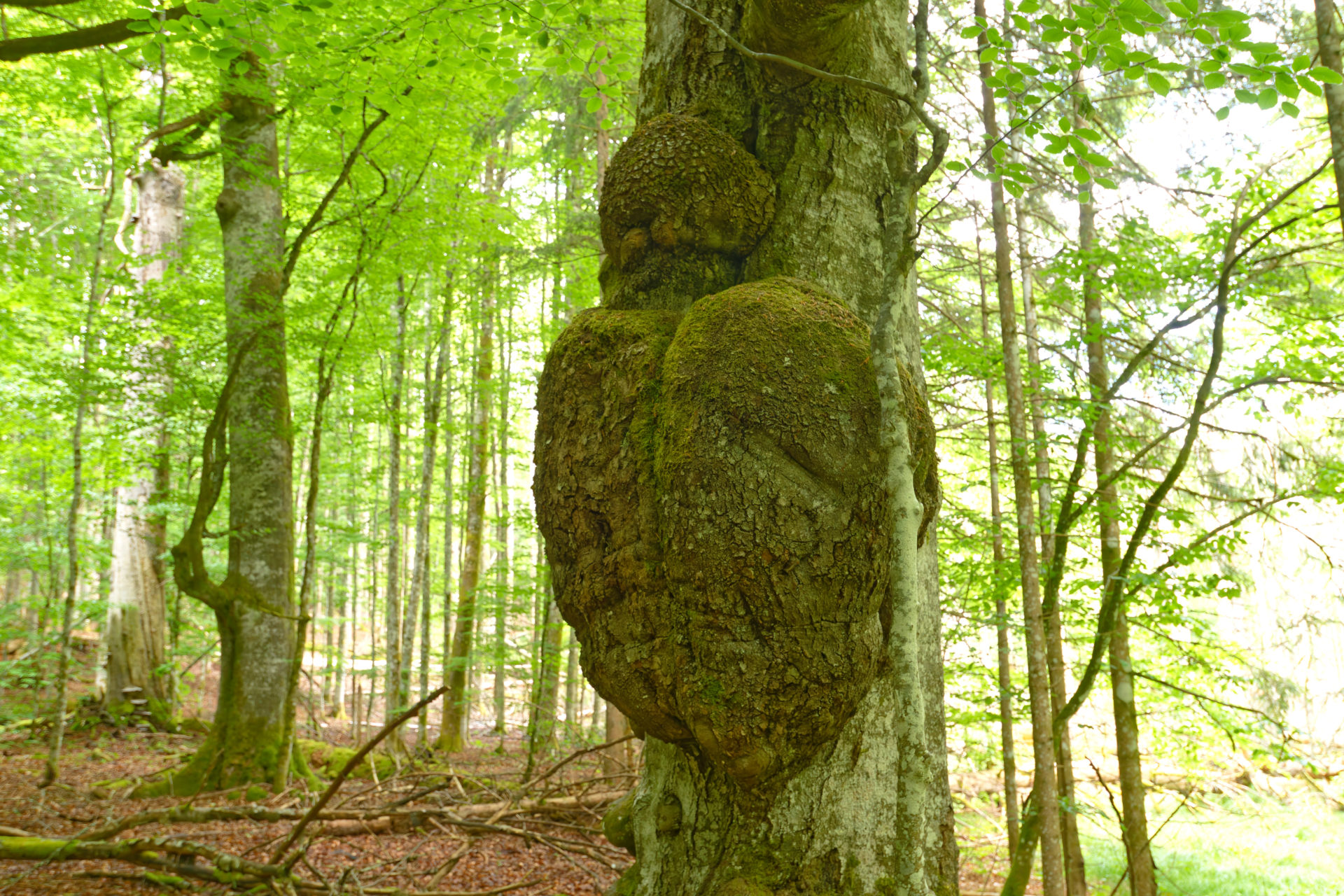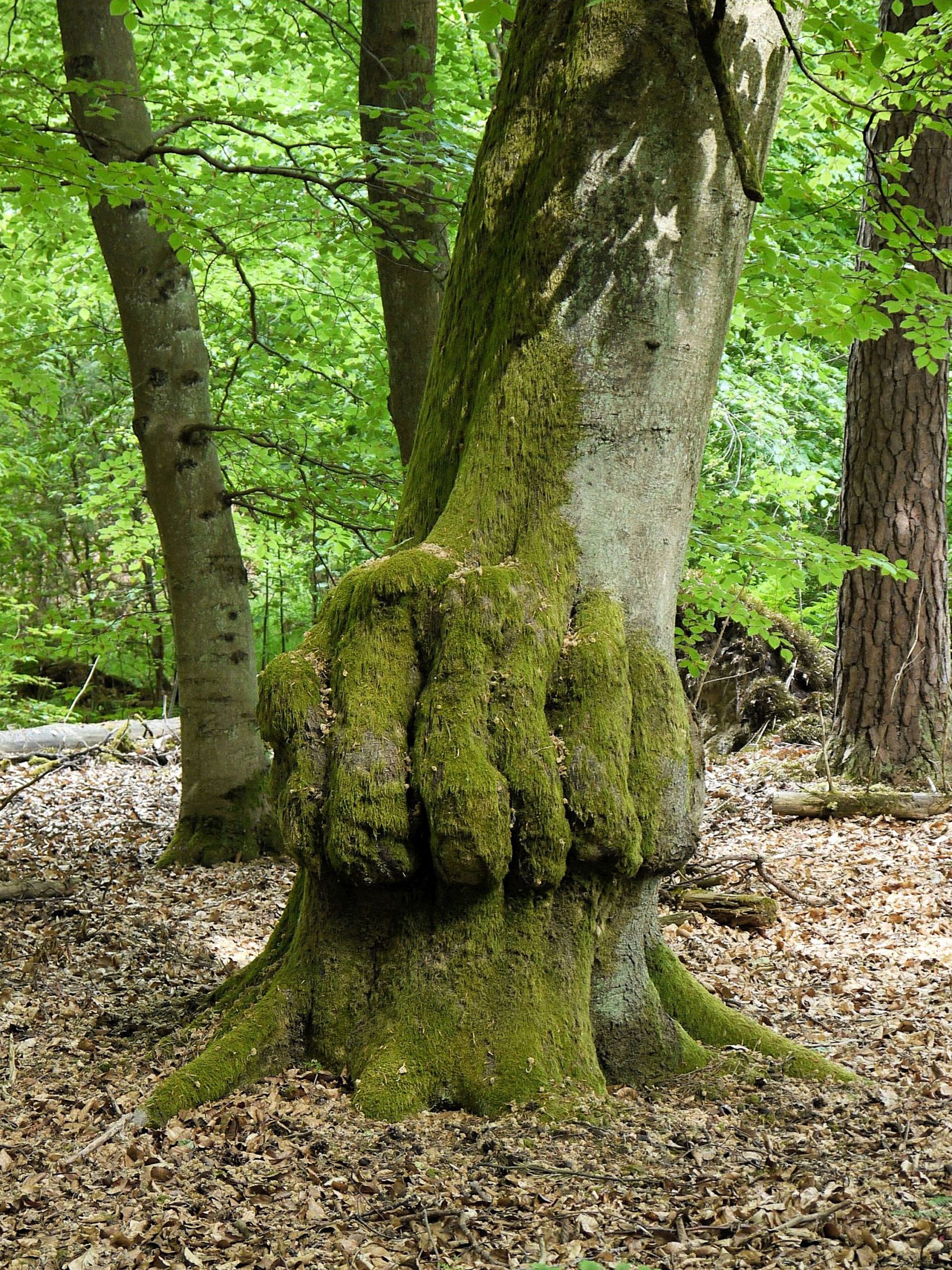 Diese Buche zeigt deine moosbewachsene Stamm-Fehlbildung, die wie eine Faust aussieht, aber mit sechs Fingern.