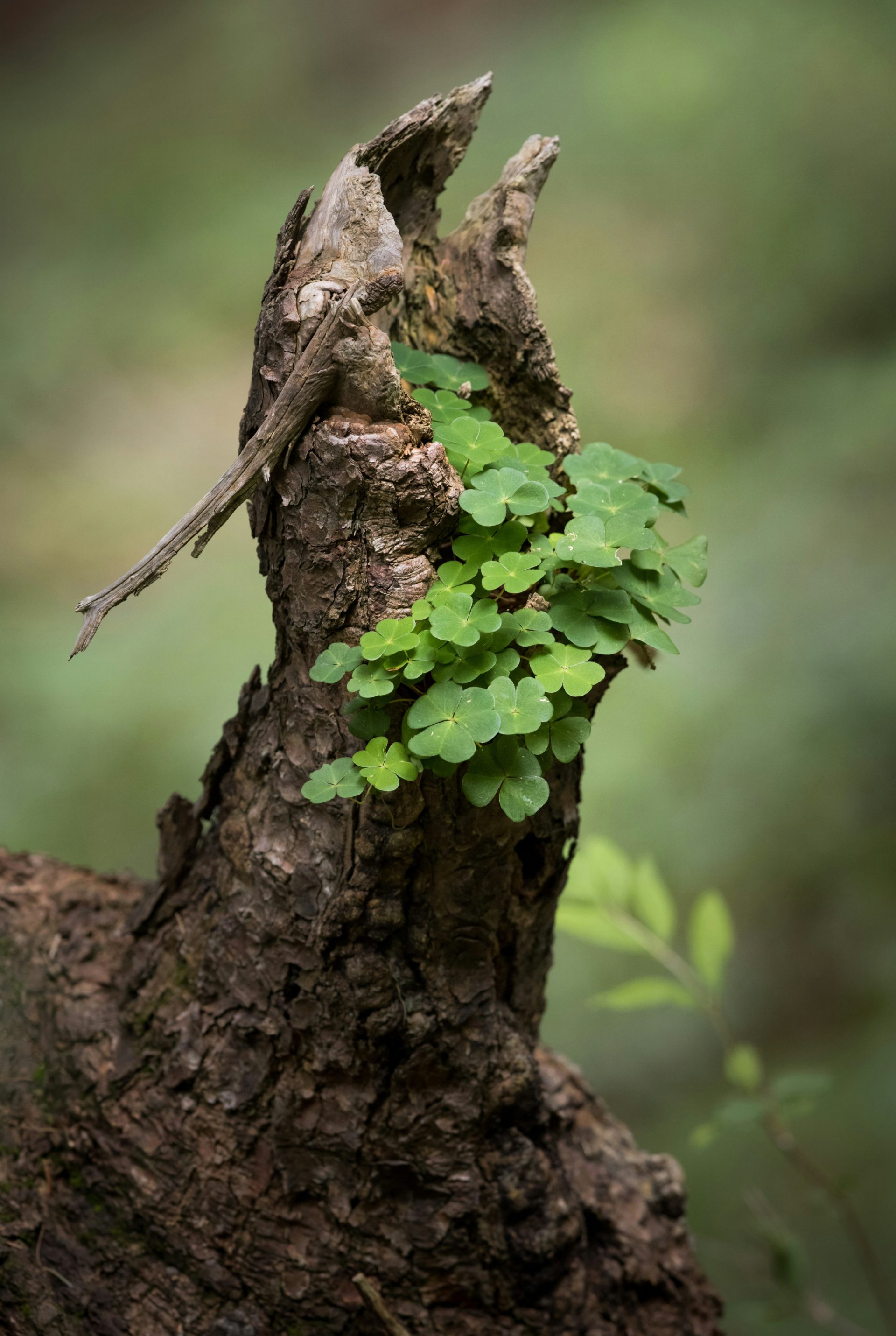 Die Aufnahme zeigt einen abgestorbenen seitlichen Auswuchs eines Baumes welcher nun als „Blumentopf“ für Klee fungiert.