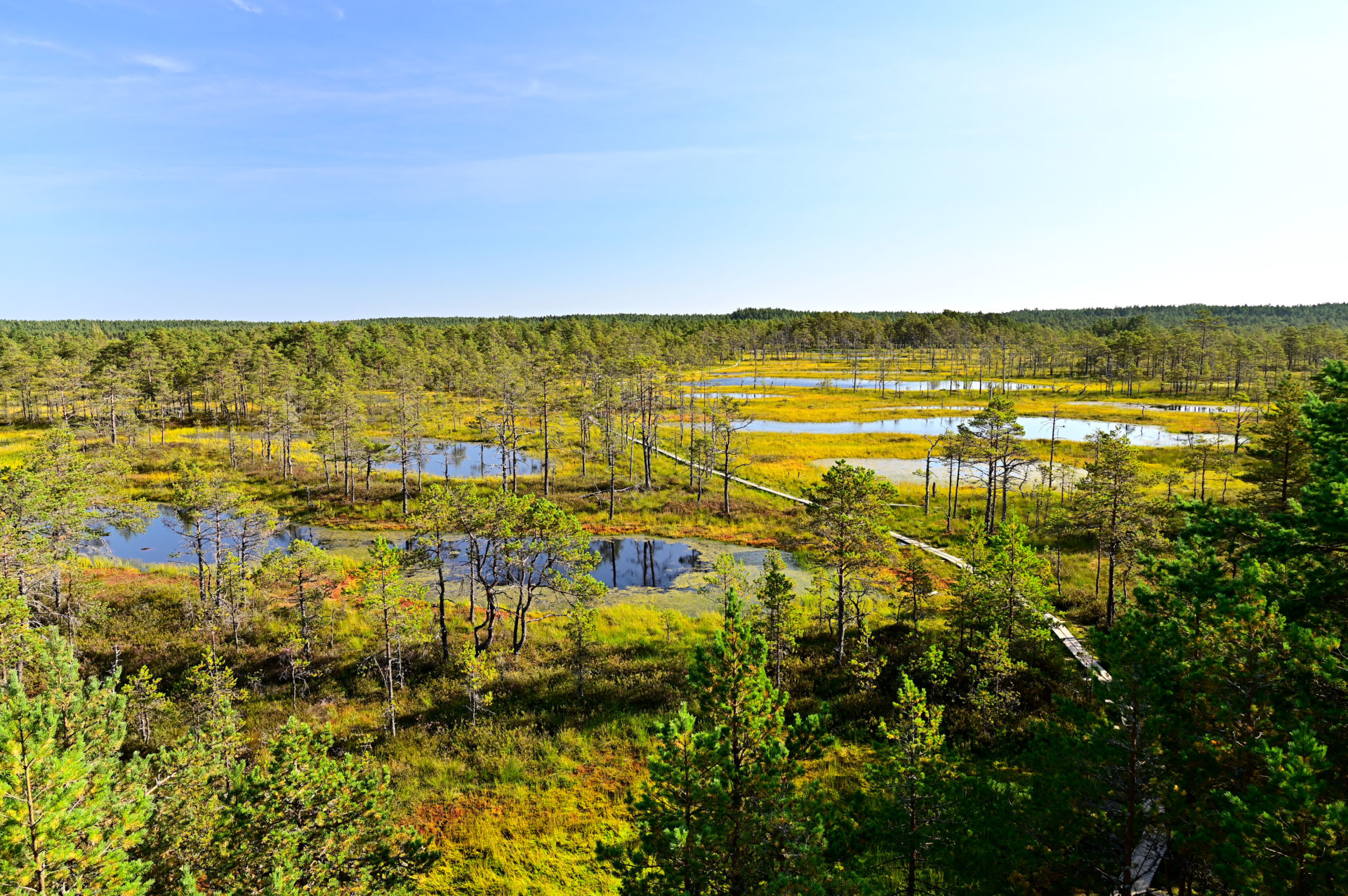 Dieses Bild zeigt einen Auschnitt der Moorlandschaft des Lahemaa Nationalparks in Estland an einem sonnigen Herbsttag. Viele „schwarze“ kleine Seen prägen die in sattes grün getauchte Moorlandschaft, die für Besucher über einen schmalen Weg aus Holzplanken zugänglich ist.