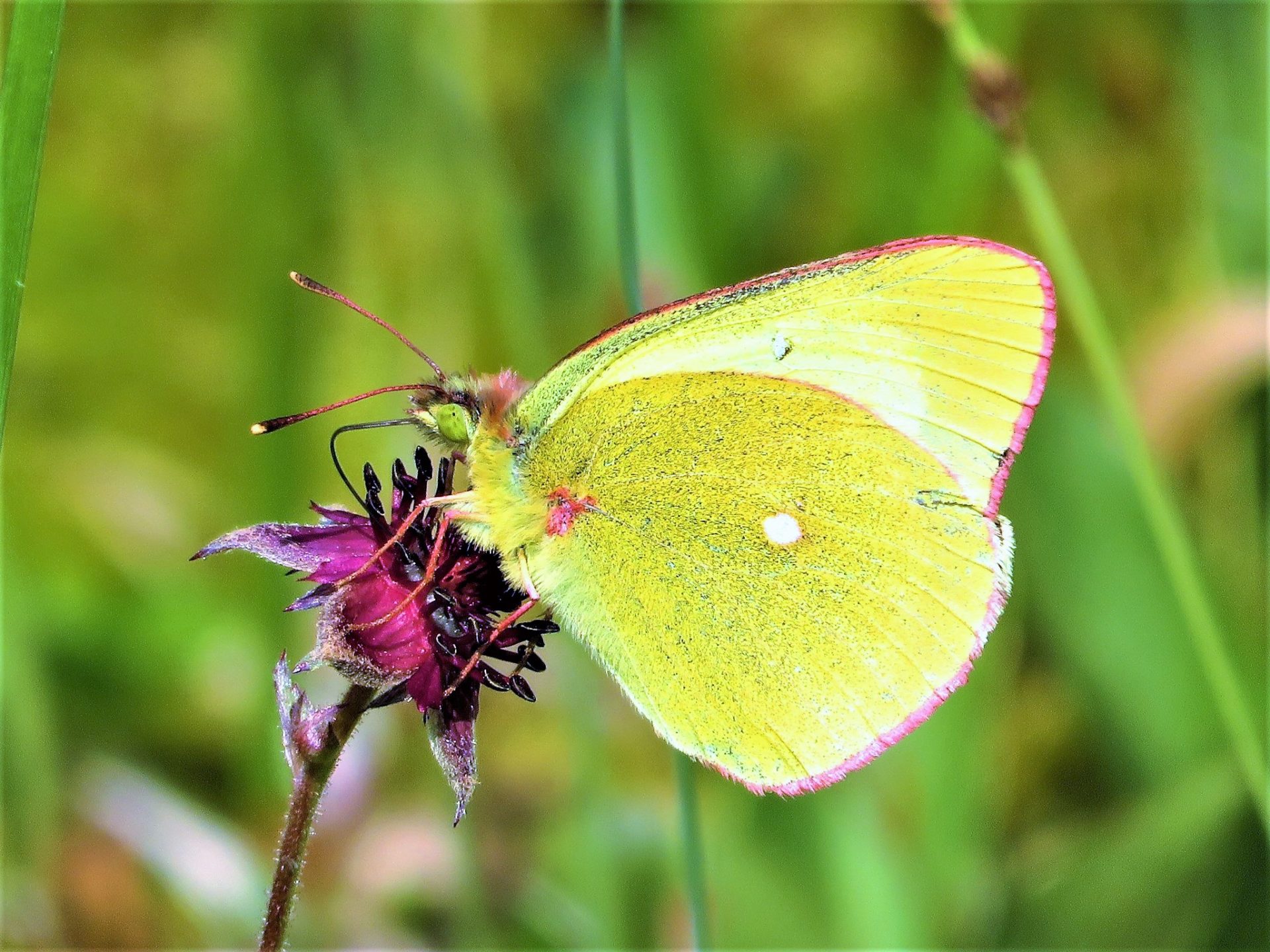 Der Hochmoor-Gelbling ist ein stark gefährdeter Schmetterling. Er kommt nur noch in wenigen Mooren in Deutschland vor, wie z. B. im Hinterzartener Moor. Dieses Exemplar labt sich am Nektar des Sumpf-Blutauges, der Blume des Jahres 2025.