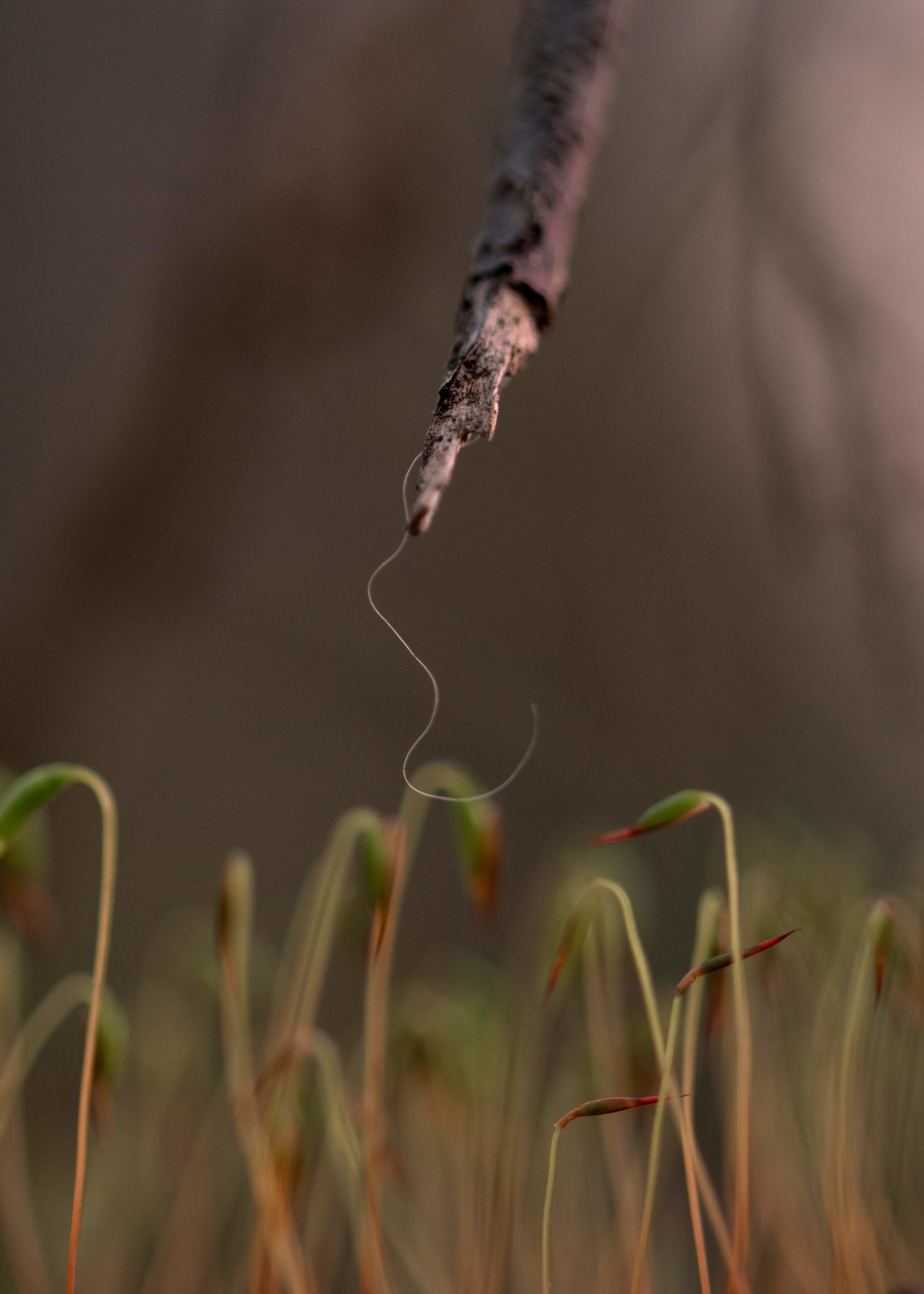 An einem nebligen Märztag entdeckte ich diese bildschönen Mooskapseln und das verlorene Haar am Zweig. Es wirkt fast so wie der Fingerzeig zwischen Adam und Gott, der Zweig gibt dem Moos Mut und so sehr sie sich auch berühren wollen, so tun sie es doch nie.