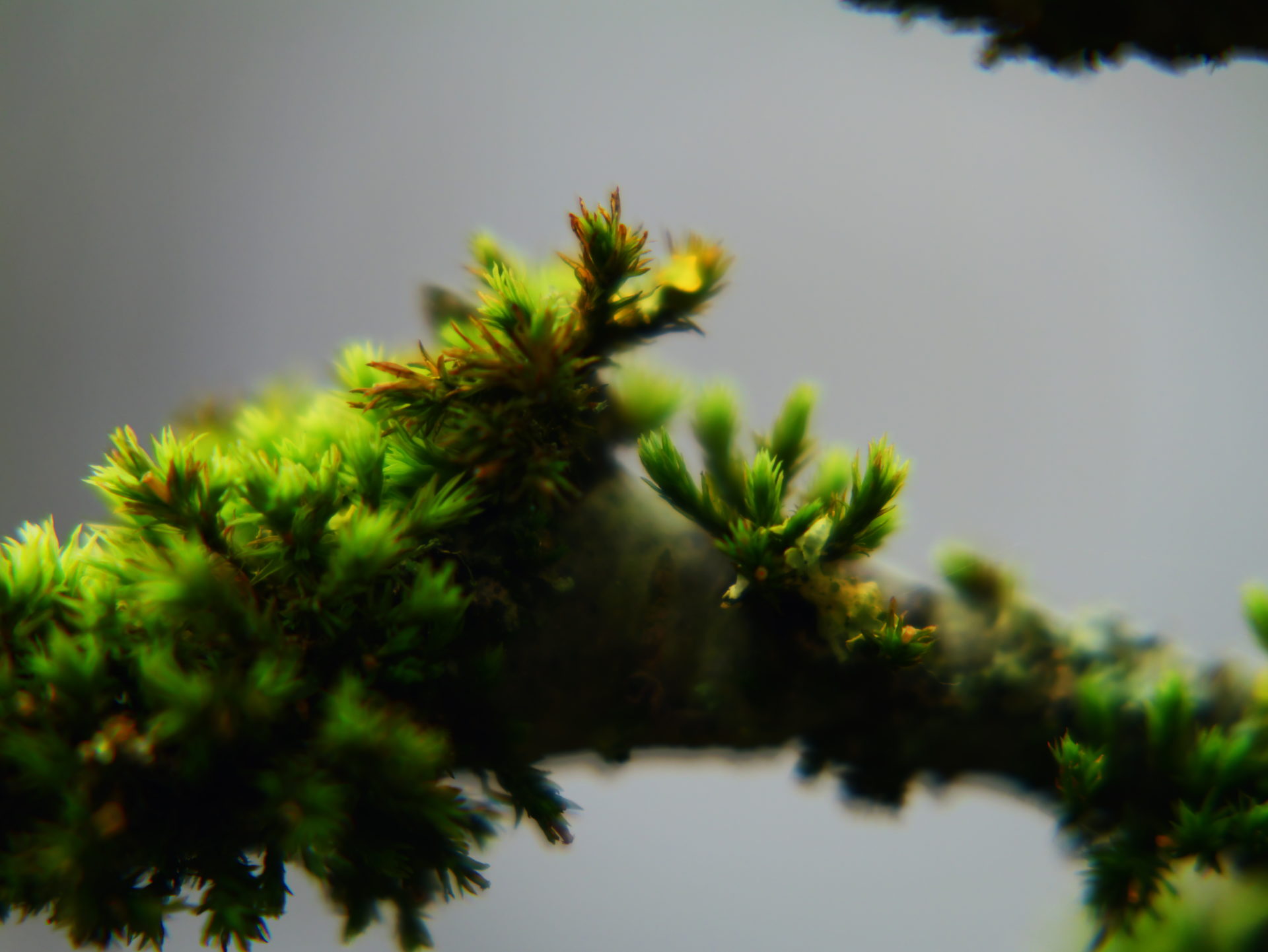 Das Bild zeigt Moos auf einem Ast meines Apfelbaums Die Aufnahme erfolgte unter Zuhilfenahme einer +4 Diopt.-Nahlinse bei 93 mm mit Blende 2,8 am 14.12.2025.