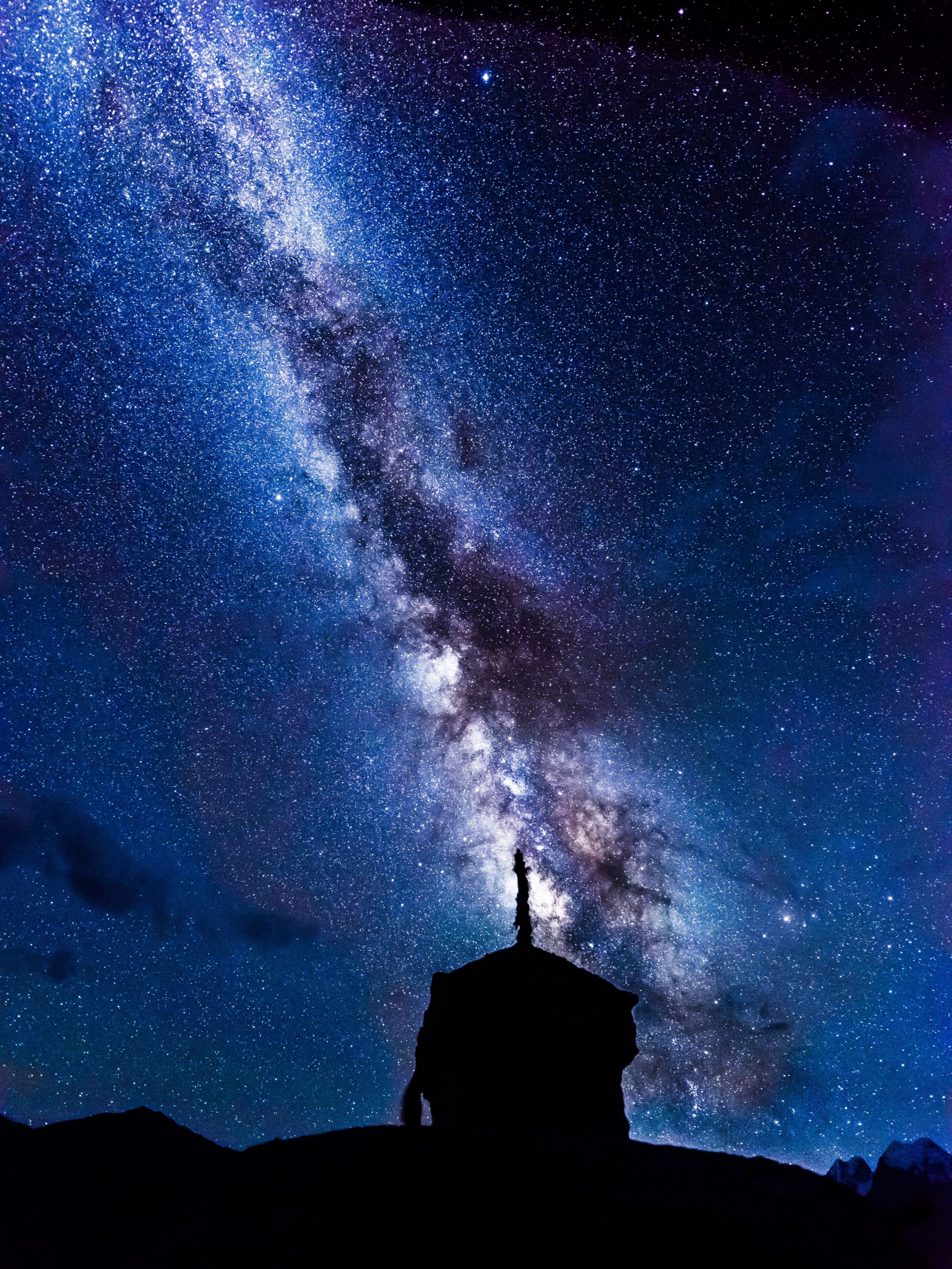 Das Foto entstand am Kloster Karsha im Zanskar Valley – Ladakh (Nordindien/ Himalaya) vor einer Stupa/ Chörte im Vordergrund. Aufgrund er hohen Lage des Klosters (ca. 4400m.ü.n.N.) ist der Sternenhimmel in der Himalayaregion besonders intensiv und klar. Stativ, ISO 6400, 14 mm, f 2,8 15 sec. Belichtungszeit