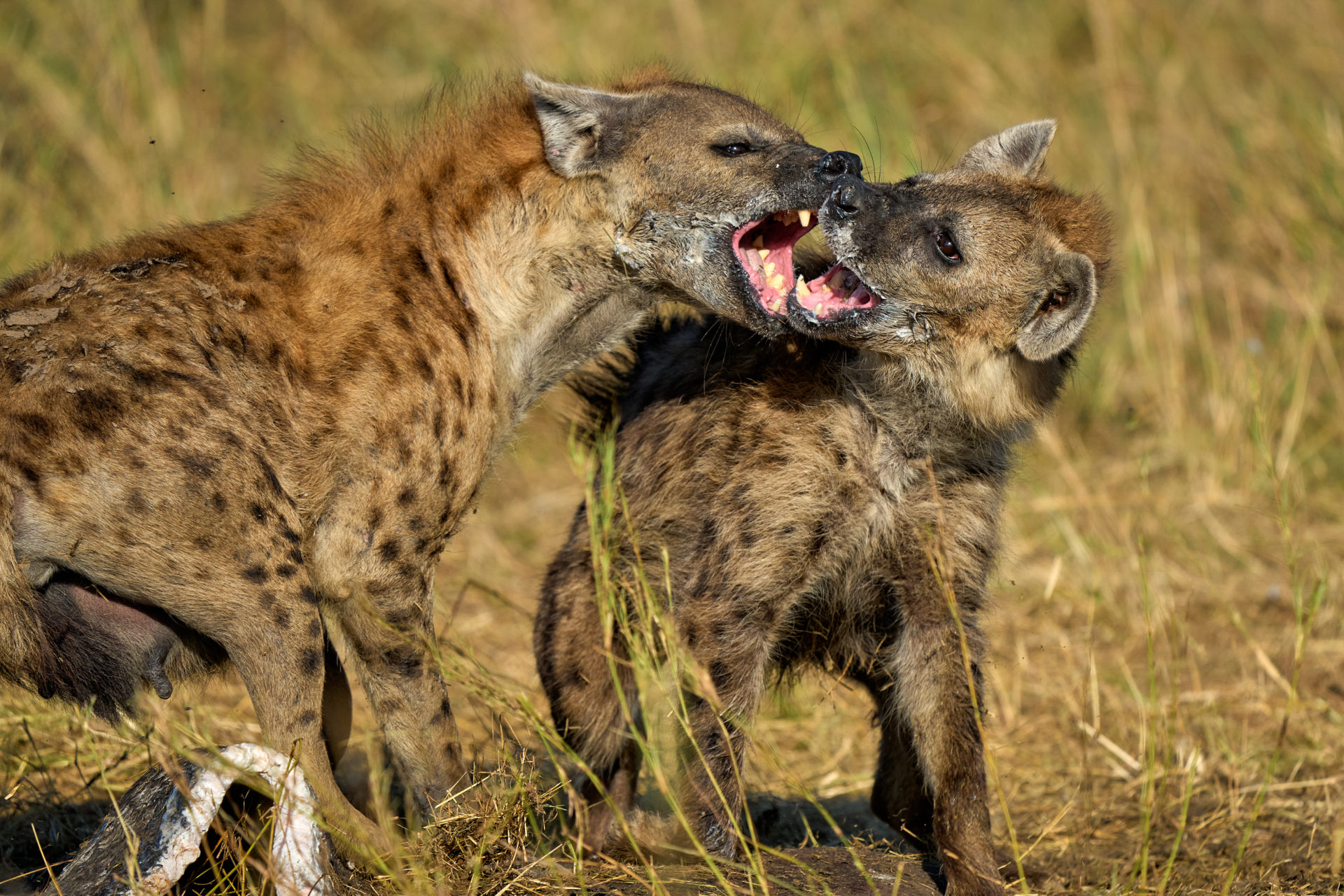 Zwei Tüpfelhyänen streiten an einem Flusspferdkadaver um die letzten Reste. Übrig geblieben ist die Haut, die am linken unteren Bildrand zu sehen ist. Den Mäulern der beiden Hyänen ist anzusehen, dass sie von der Haut schon gekostet haben.