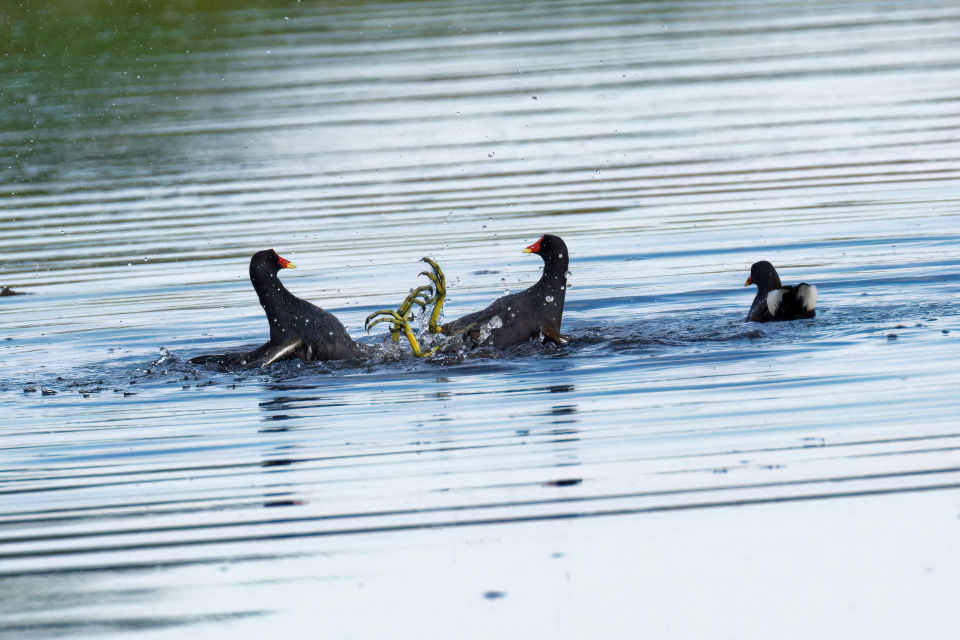 An einem Weiher in der Nähe konnte ich schon oft Teichhühner beobachten. Bis jetzt konnte ich nur Revierkämpfe von Blässhühnern beobachten. An diesem Tag sollte es soweit sein. Zwei Teichhühner fingen plötzlich an zu kämpfen. Das Schauspiel dauerte nicht sehr lange.