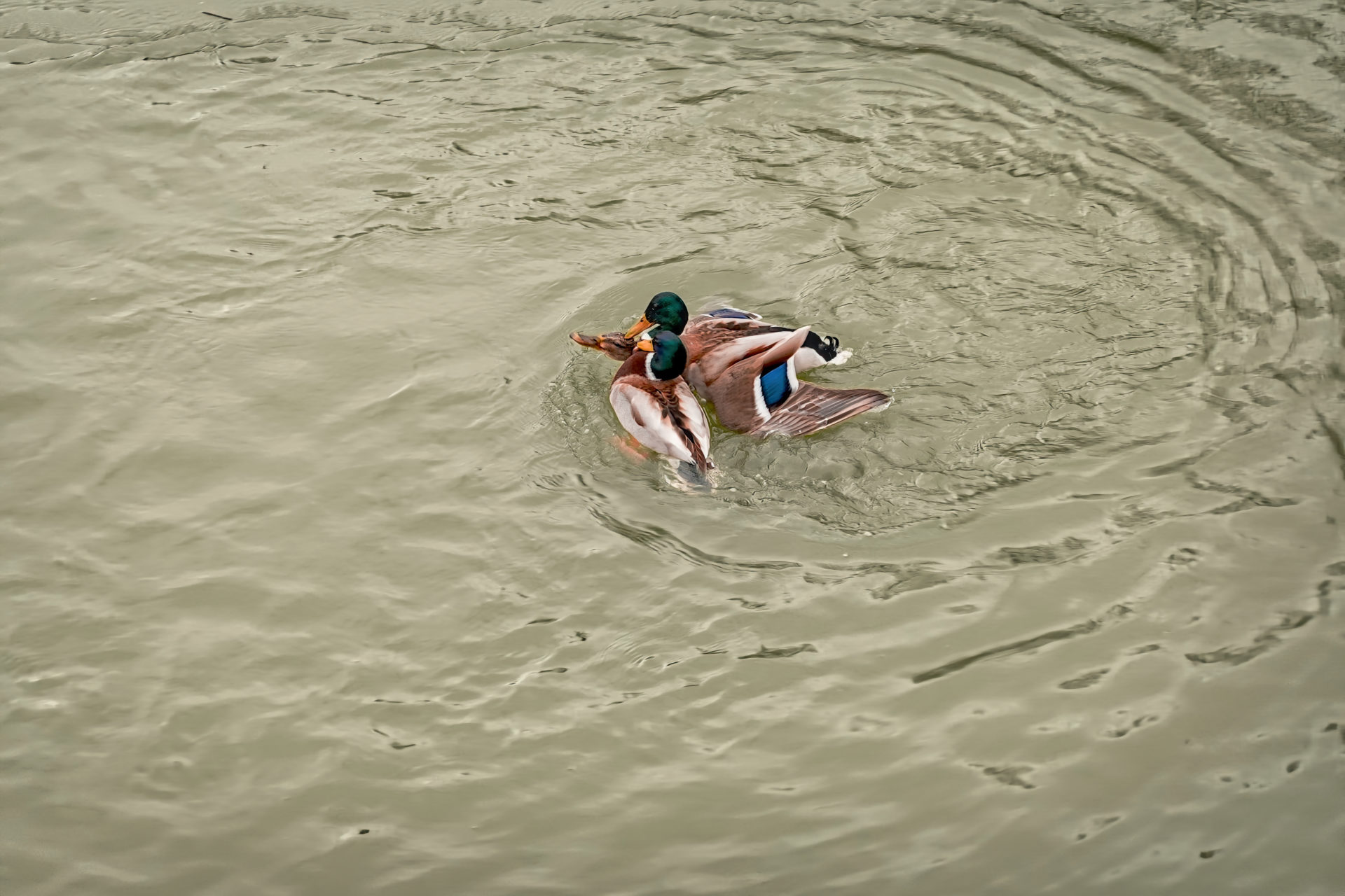 Der Situation vorausgegangen wurde die Stockentendame von einem der Erpel mit einer sehenswerten Flugshow verfolgt. Die Entendame landete nach mehreren Runden auf der Eisfläche des zu dreiviertel zugefrorenen Teiches des Hauptfriedhofs. Die Landeaktionen und Laufversuche der beiden war auf der rutschigen Eisfläche sehr zur Freude der Spaziergänger rund um den Friedhofsteich. Als die Entendame ins Wasser flüchtete, kam noch ein Erpel dem anderen zur Hilfe und schon hatte die Dame keine Chance mehr. Der eine packte sie und drückte sie mehrere Sekunden unter Wasser, was für eine Totenstille rund um den Teich sorgte. So ein Spektakel sieht man nicht jeden Tag und ich war froh, dass ich bei dem Spaziergang meine Kompaktkamera dabei hatte und die Situation festhalten konnte. Schließlich durfte die Entendame wieder auftauchen und nach einer kurzen Erholungsphase schwammen sie wieder gemeinsam an Land zu ihrer Unterkunft.