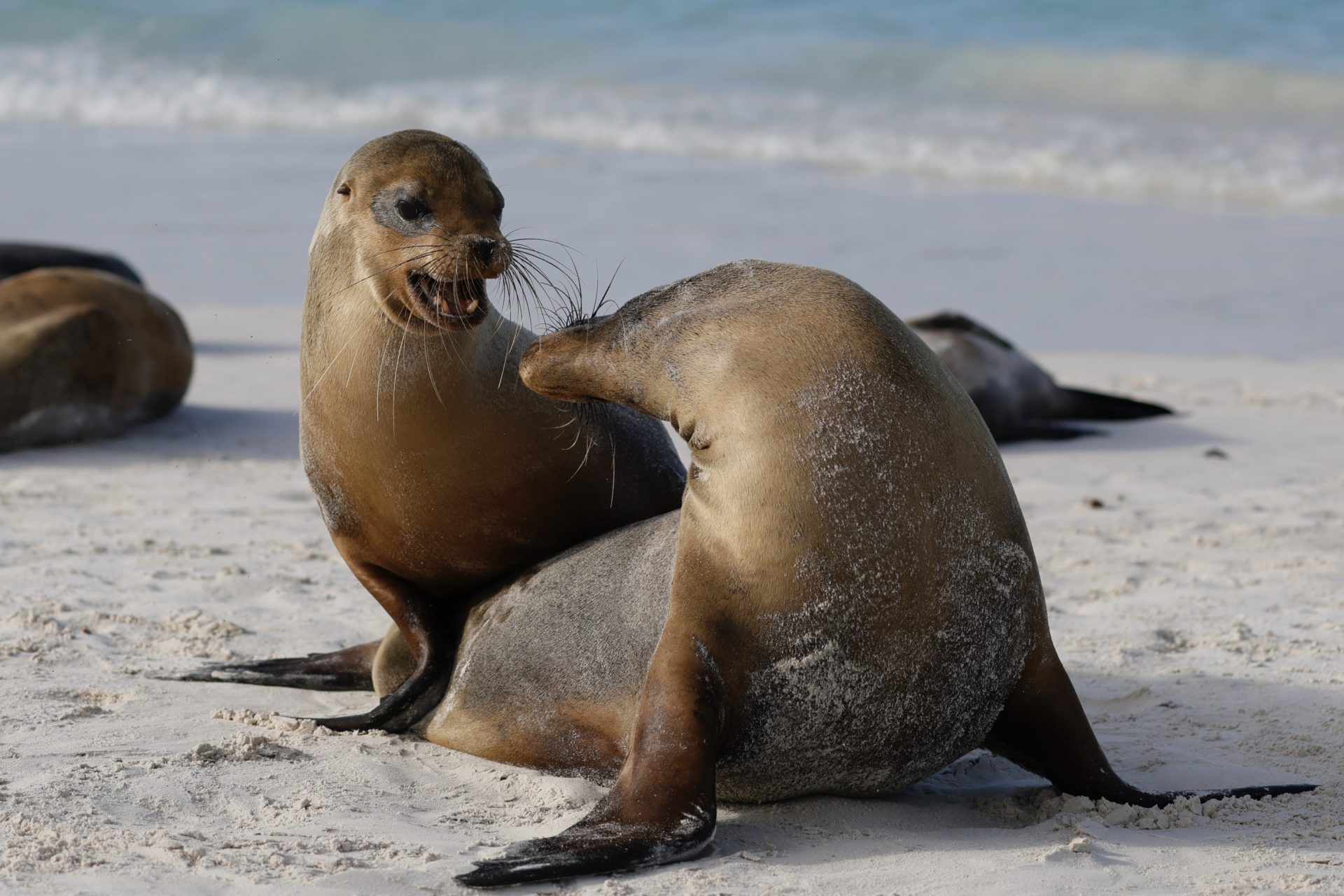 Die jugendlichen Seehunde lassen sich auf Galapagos nicht durch Besucher beeindrucken und üben sich in jugendlichen Raufereien als Vorbereitung auf spätere Revierkämpfe. Im April 2024
