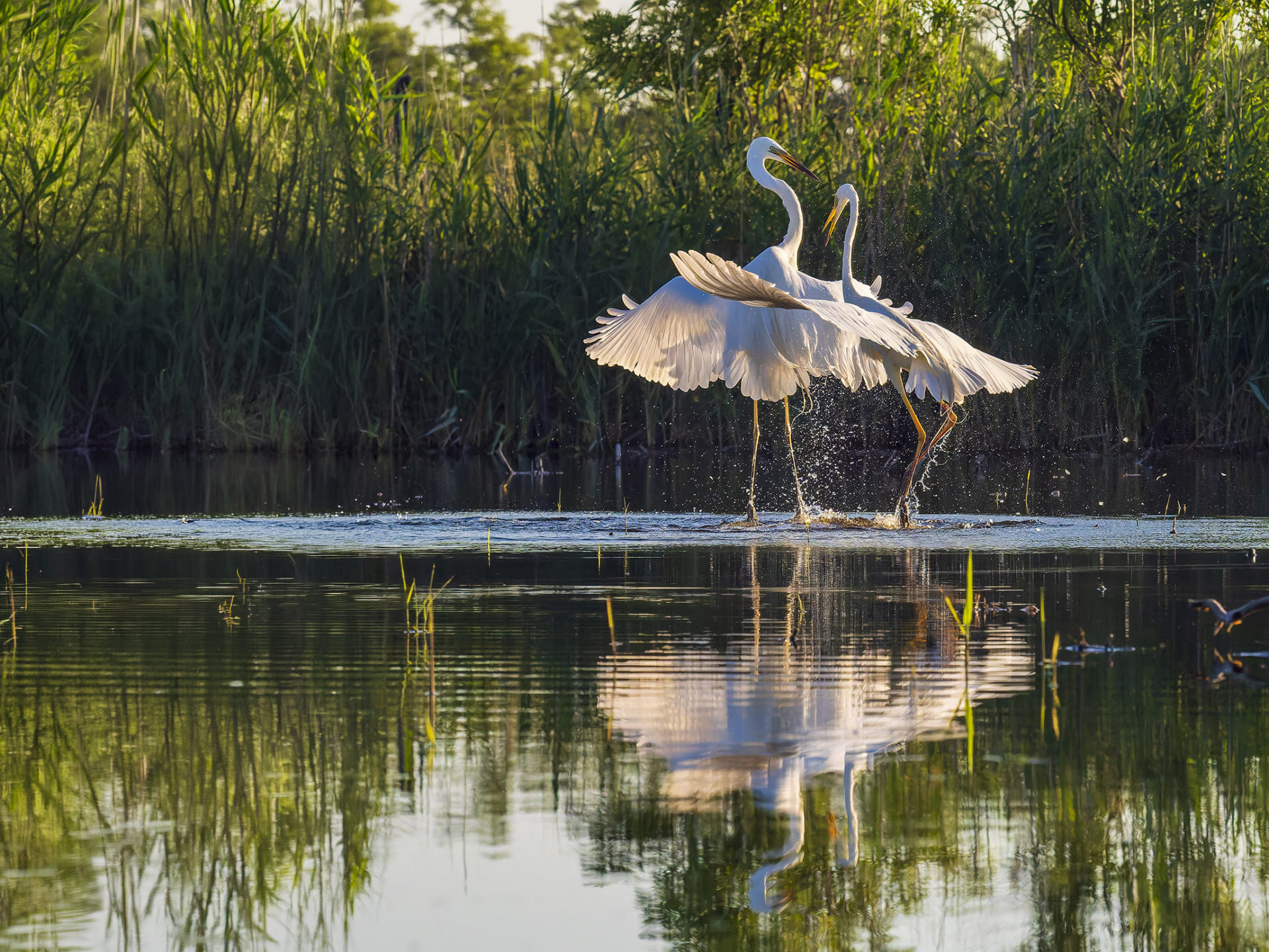 Revierkampf der Silberreiher ( Ardea alba) im Raum Subotica. Zahlreiche Tümpel und Seen bieten großartige Möglichkeiten der Vogelfotografie. Fotografiert mit OM1 II , OLYMPUS 150-400, F7.1, 1/4000, ISO 6400,- 1 LW.