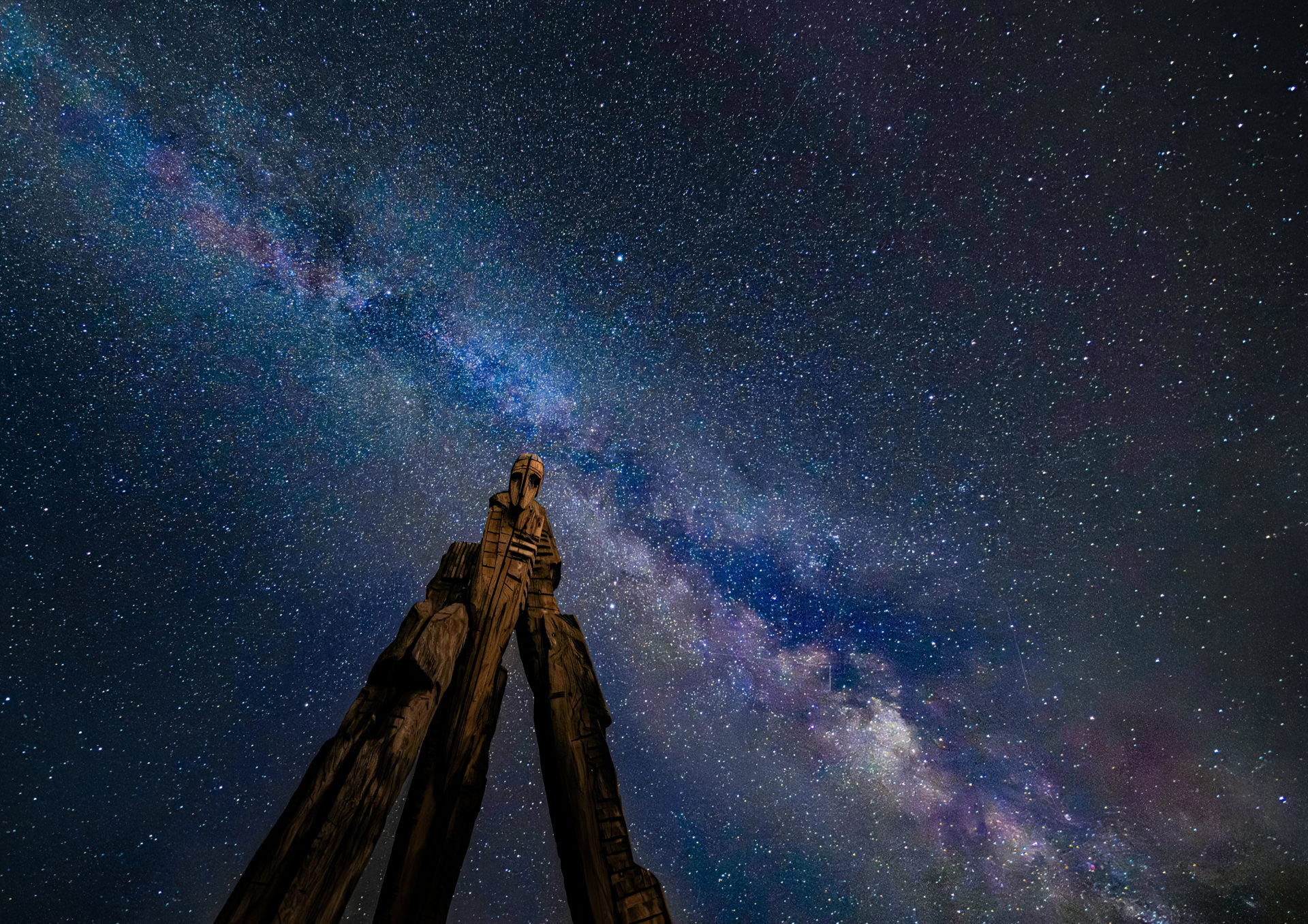Das Lothardenkmal auf dem Siegiskopf im Schwarzwald erinnert an die verheerende Wirkung des ‚Weihnachtssturms‘ Lothar von 1999. Es stammt vom Künstler Norbert Feger. 3 hohe Baumstämme wurden verbunden und die oberen Enden kunstvoll-schaurig zu Köpfen verändert. In einer für Astrofotografen ungewöhnlich warmen August-Nacht zeigte sich im Blick nach oben dahinter das Zentrum unserer Heimatgalaxie. In dieser Nacht erreichte auch der Meteorstrom der Perseiden sein Maximum, weshalb einige Linien, bedingt durch die Langzeitbelichtung, zu sehen sind.