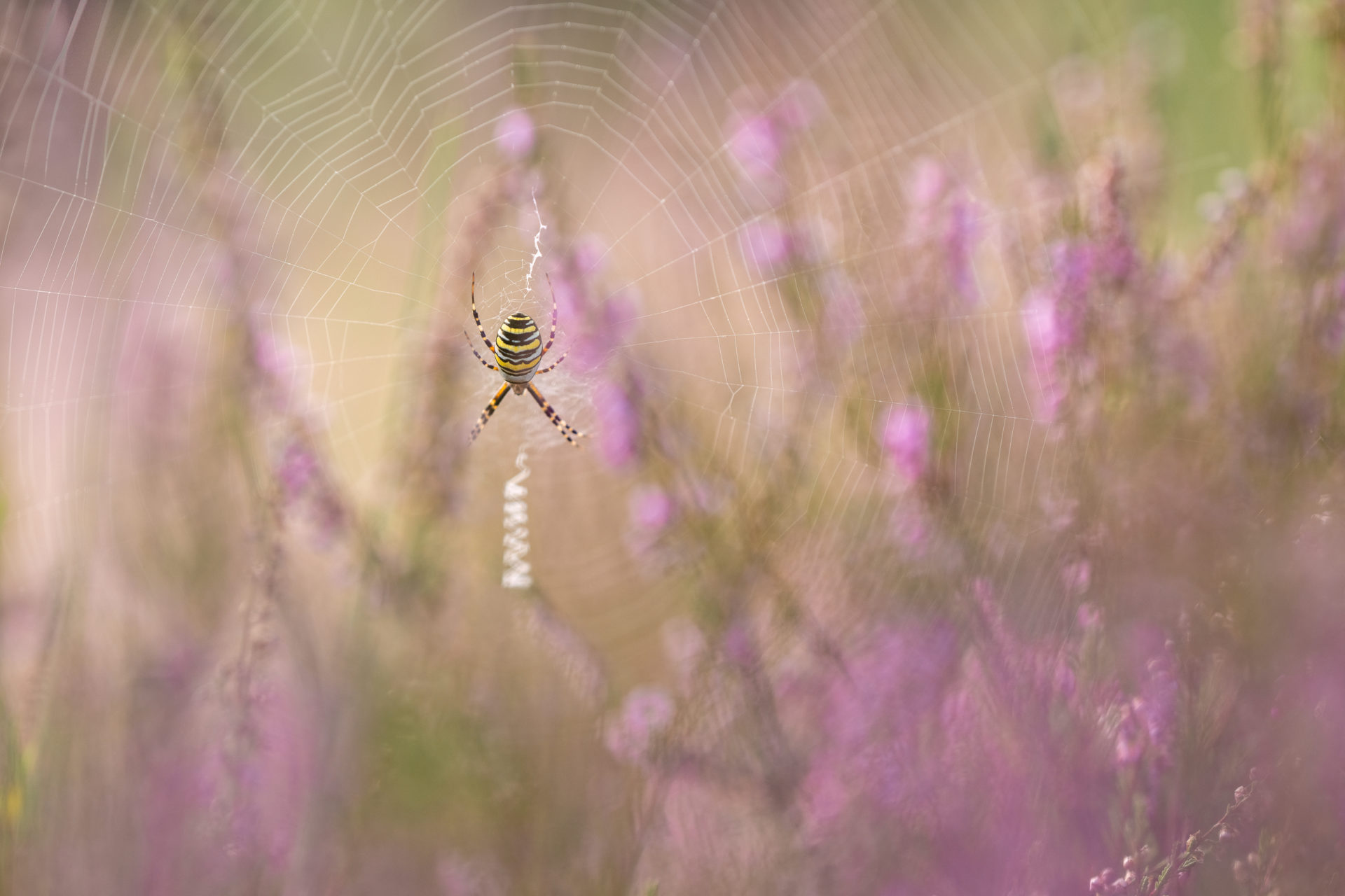 Die zarten Farben der Heideblüte in der Unschärfe vor und hinter der Wespenspinne in ihrem Netz gaben eine sehr fotogene Umgebung ab.