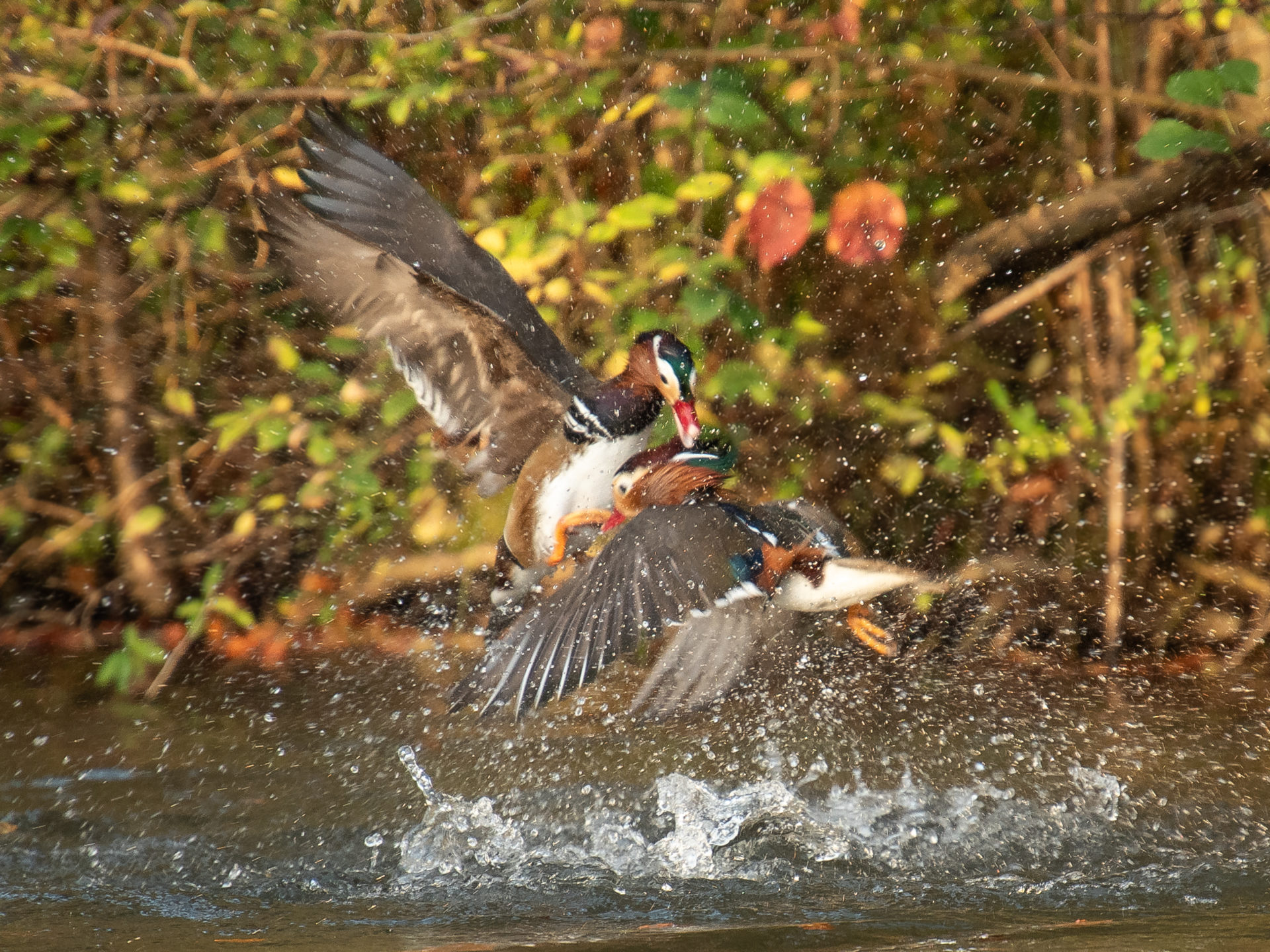 Herbstnachmittag im Englischen Garten/München. Kämpfende Mandarinenten.