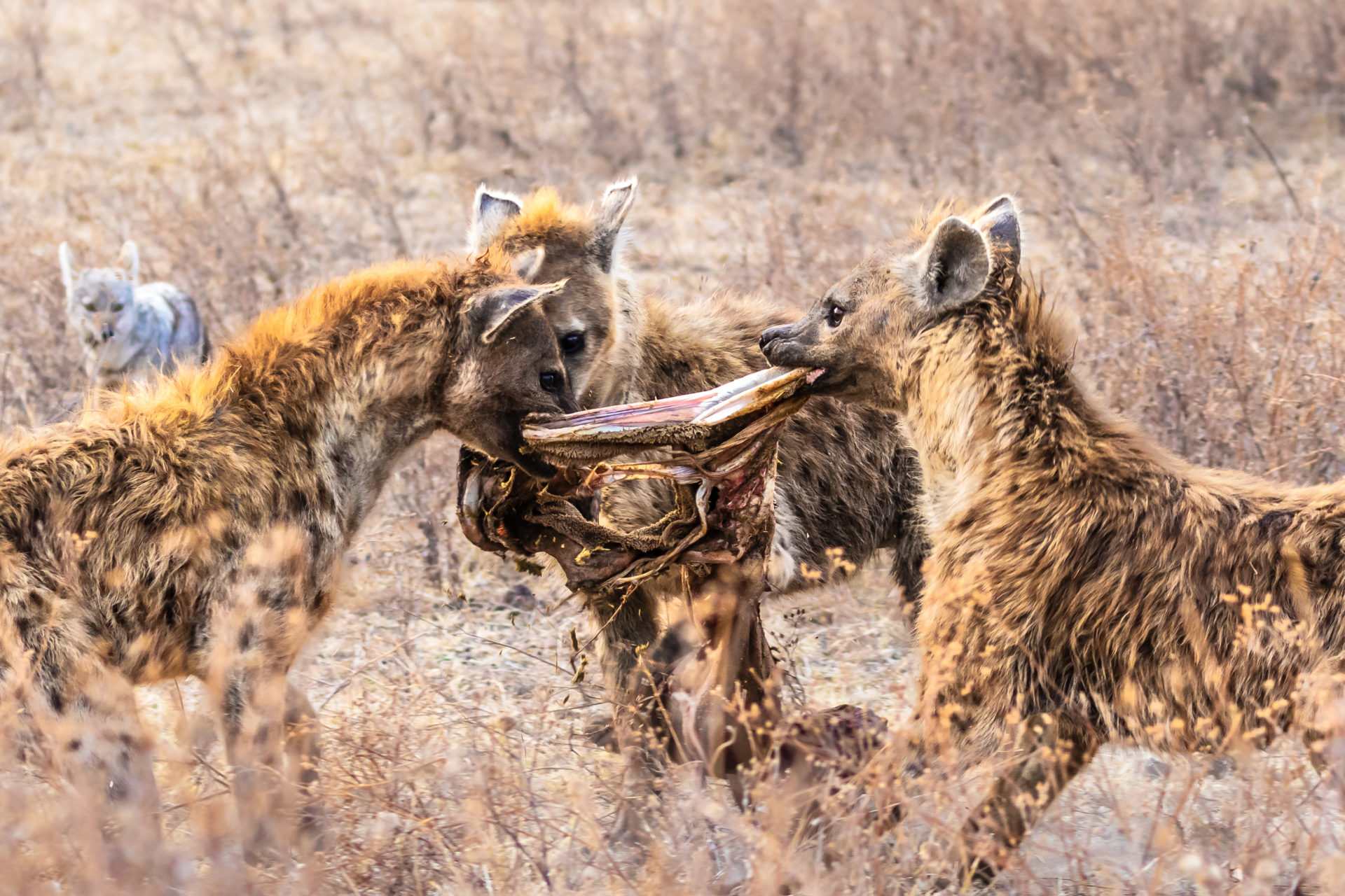 Drei Fleckenhyänen reißen sich um den von einem Löwen übriggelassenen Riss. Im Hintergrund wartet bereits der Nächste in der Verwertungskette, ein Schabrackenschakal. Die Aufnahme entstand im Ngorongoro-Krater in Tansania in den frühen Morgenstunden – daher das pastellfarbene rosa Licht. Da wir im Dachzelt am Kraterrand die Nacht verbrachten, konnten wir gleich in der Morgendämmerung in den Krater hinunterfahren und so die nachtaktiven Raubtiere noch eine Weile beobachten.