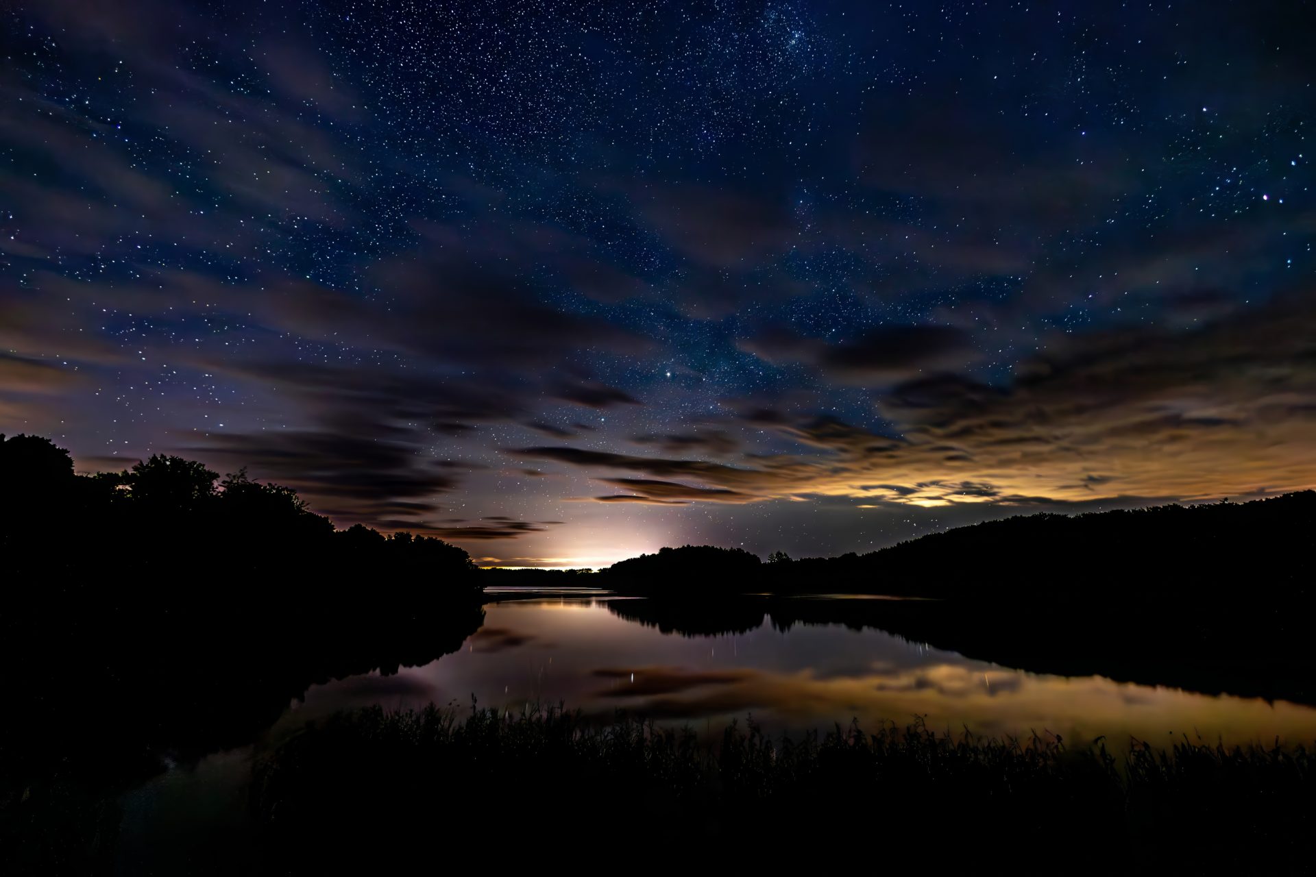 Das Licht der Sterne und die ziehenden Wolken spiegeln sich im ruhigen See. Ein besonderer Moment.