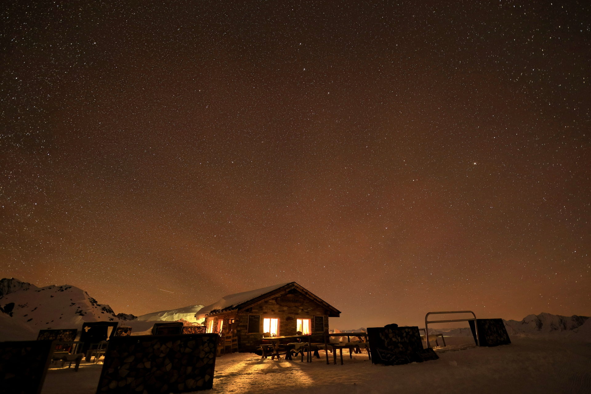 Eine klare Nacht auf dem Eggishorn im Winter ermöglichte mir diese Milionen von Sonnen in unserer Galaxie zu sehen. Das Licht in der Hütte gab der Szene eine ganz spezielle Stimmung