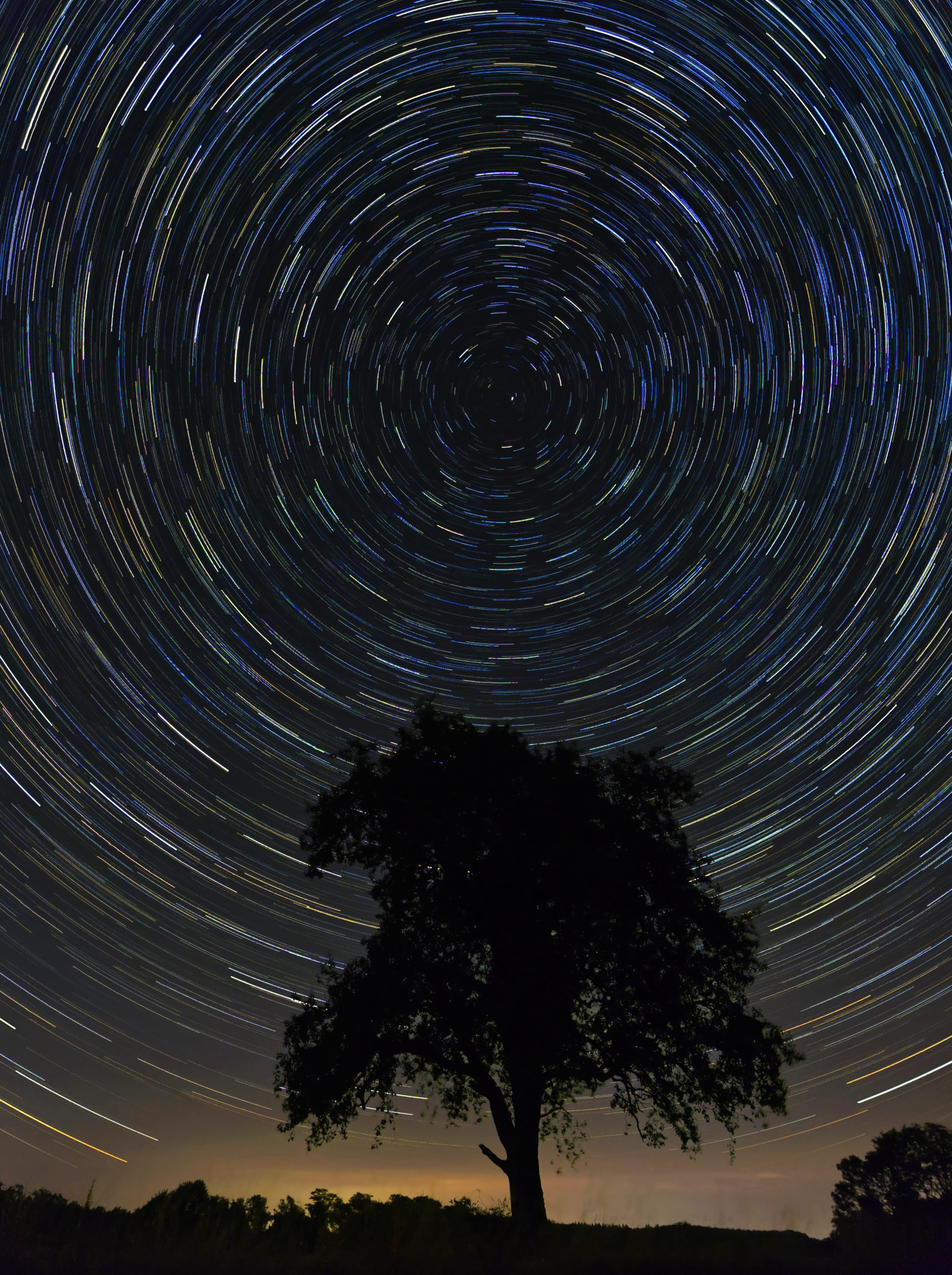 Das Foto wurde mit Hilfe der kamerainternen Langzeitbelichtungsfunktion (Live-Composite) aufgenommen. Die Kamera wurde so auf den Polarstern ausgerichtet, dass ein Sternenkranz zentral über dem Birnbaum sichtbar wurde.