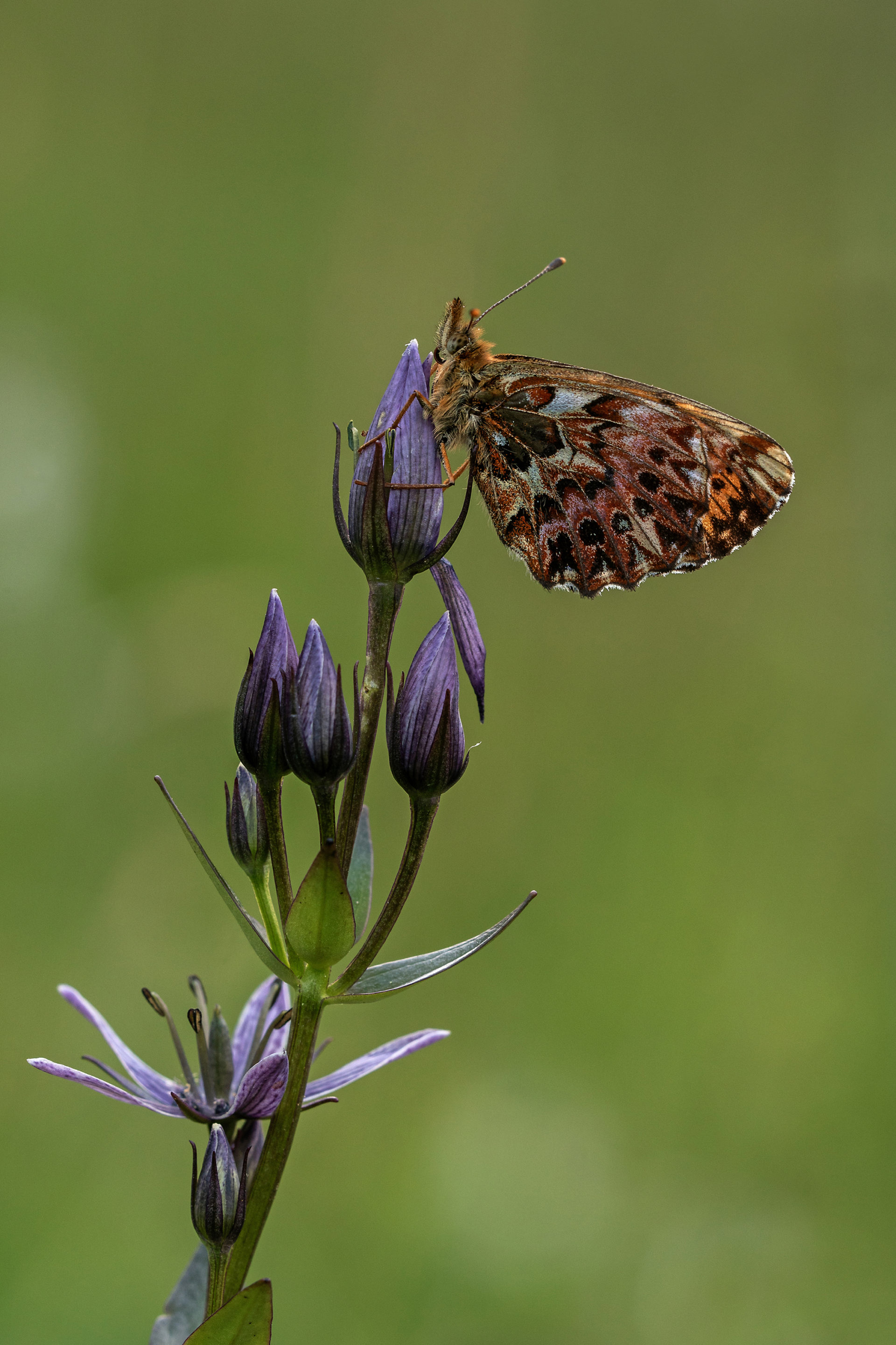 An diesem Abend war ich auf einer Alp entlang eines ausgedehnten Hangmoores unterwegs. Dann auf einmal, was für ein Anblick! Einen schönen Schlafplatz hatte er sich ausgesucht, dieser hübsche Falter. Natterwurz-Perlmutterfalter (Boloria titania) auf Moorenzian (Swertia perennis)