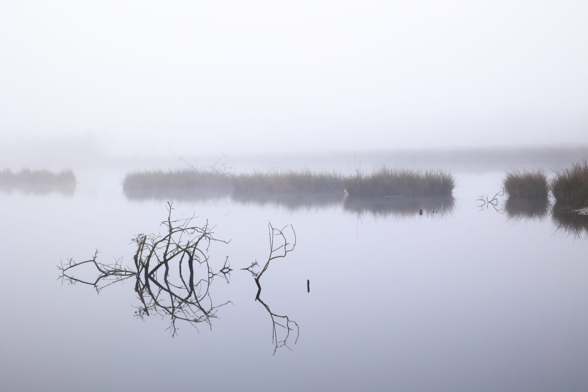 An einem schnee-und eisfreien Dezembermorgen wanderte ich durch dieses Nebelverhangene Moorgebiet.Ich mag dieses Wetter sehr und konnte viele minimalistische Motive fotografieren.Dieser tote Ast spiegelte sich im ruhigen Moorwasser.