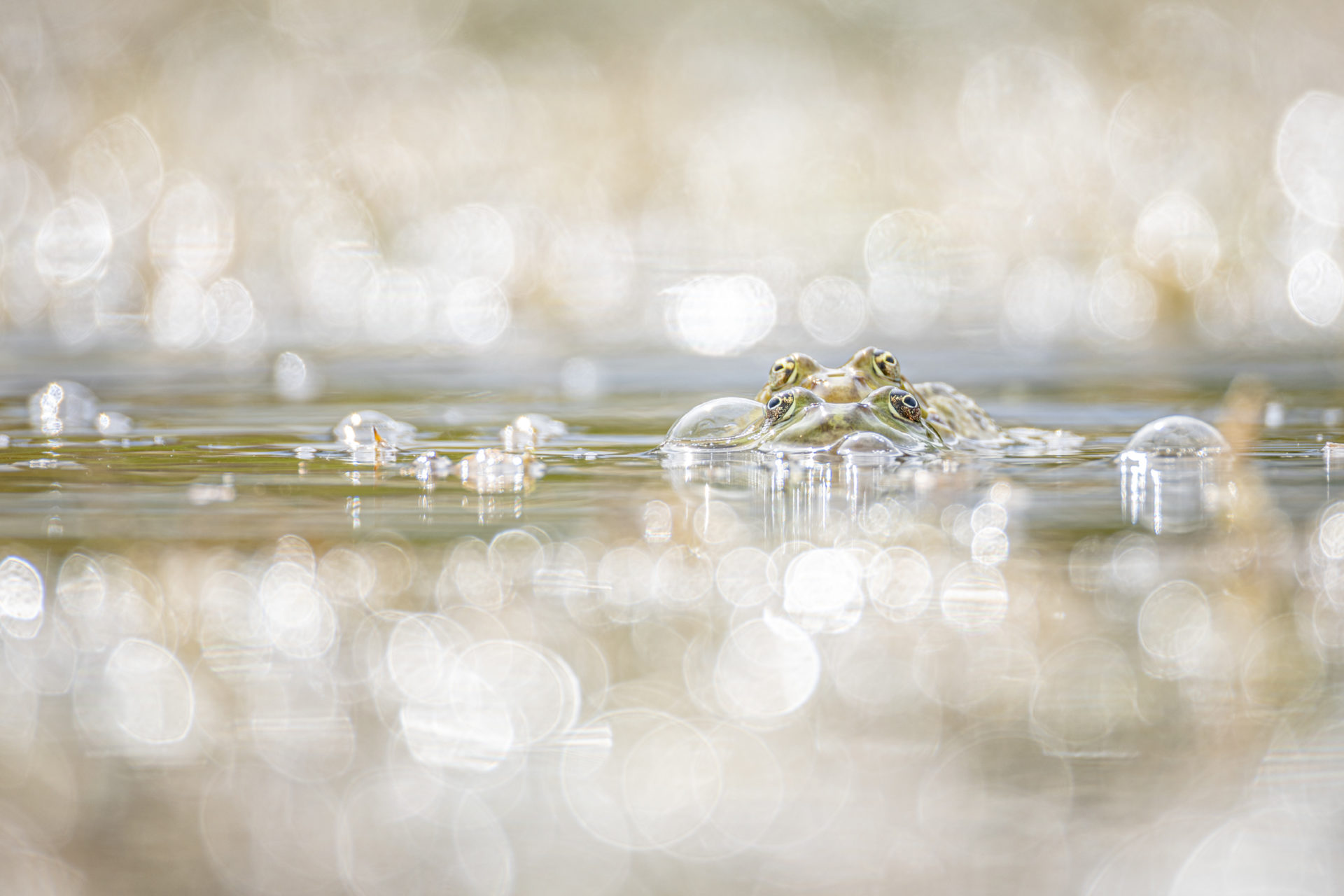 Als ich die Frösche im Wasser fand, wünschte ich mir anfangs, es wäre bewölkt, damit ich sie bei gleichmäßigem Licht fotografieren kann und nicht in der grellen Mittagssonne. Doch dann stellte ich fest, das genau dieses Licht mir magische Reflexe beschert und statt normalen Bildern, magische Aufnahmen ermöglichten. Dieses davon ist mein Lieblingsbild geworden. Obwohl ich am nächsten Morgen noch einmal hin bin und bei aufgehender Sonne ebenfalls wunderschöne Bilder machen konnte.