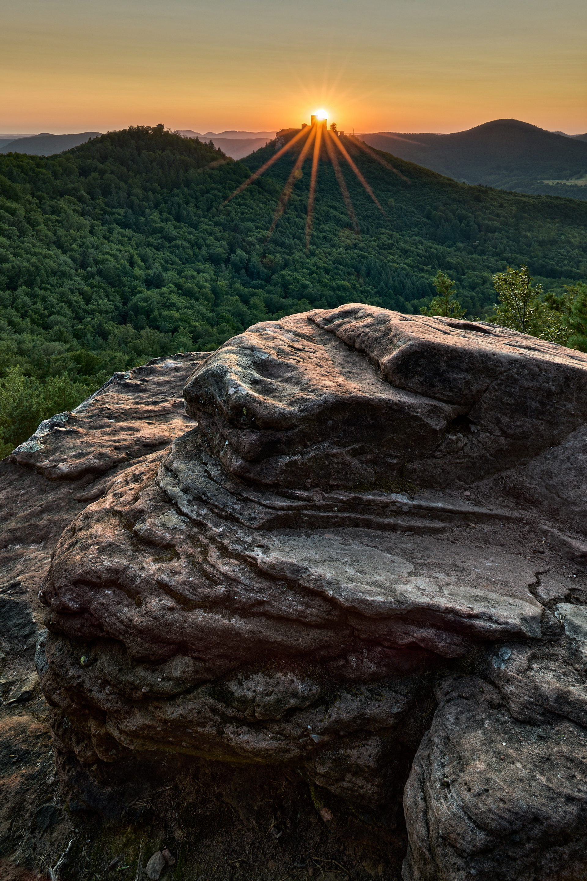 Slevogt-Felsen im Pfälzer Wald mit Blick in Richtung Burg Trifels bei Sonnenuntergang