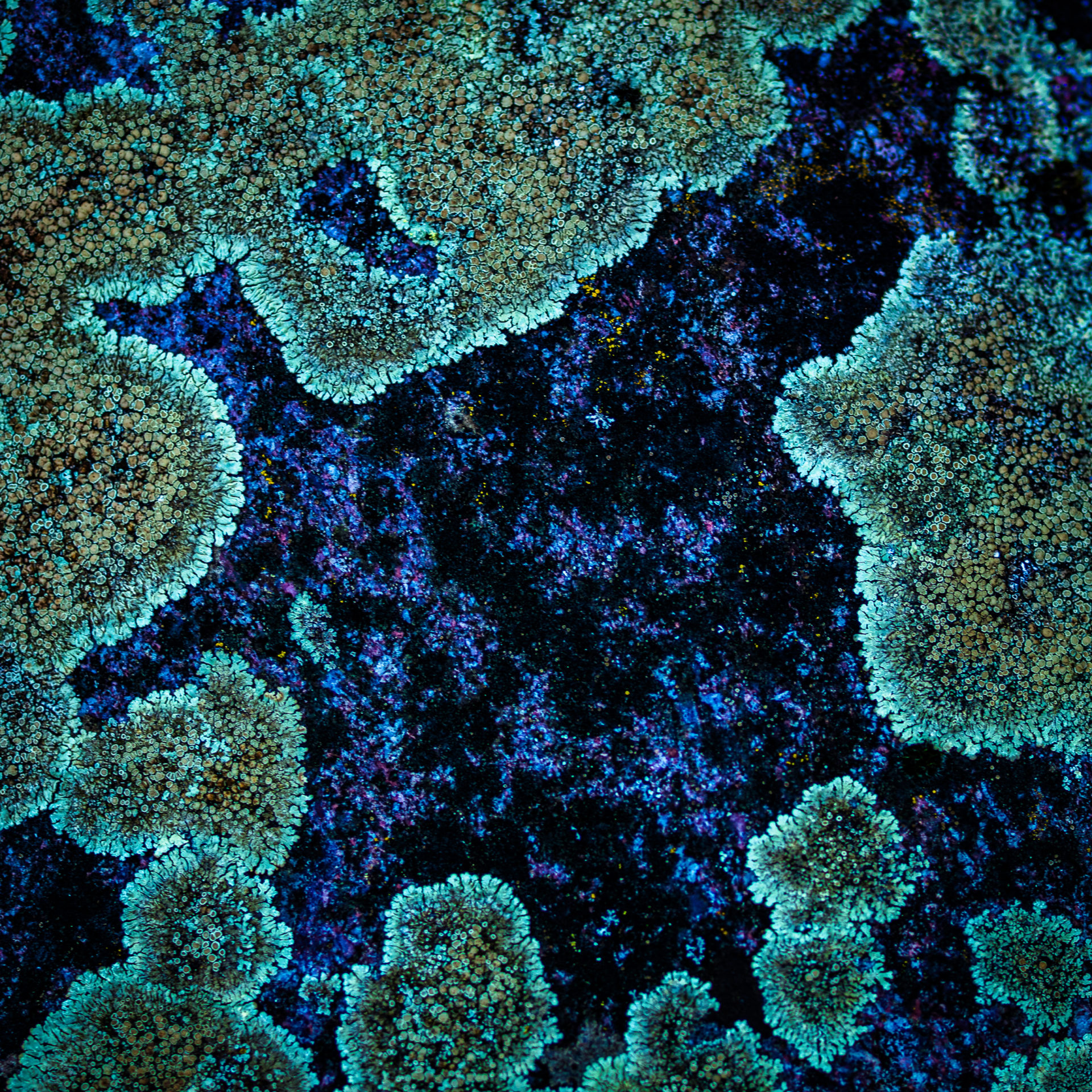 Am Rand unseres Teichs ragen einige flache Steine knapp über den Wasserspiegel. Darauf haben sich im Laufe der Jahre ganze Flechtenlandschaften gebildet. Sind sie feucht und das Licht gut, dann werden kommen ihre Farben schön zur Geltung.