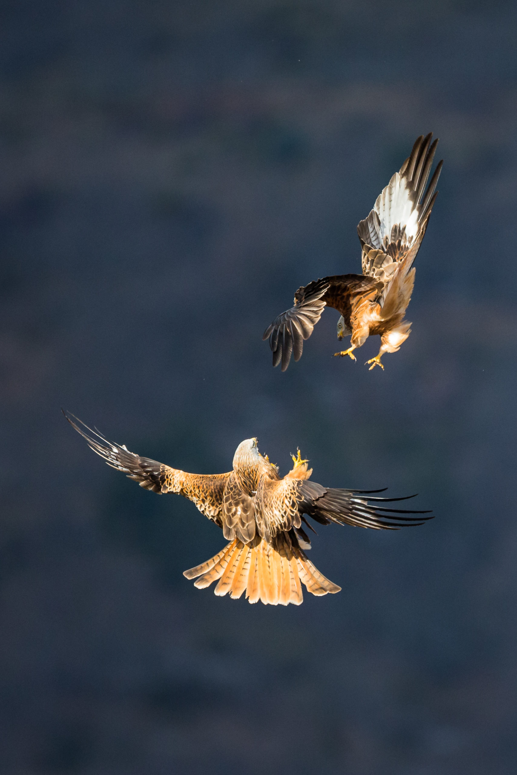 Dieses Foto zeigt einmal mehr, dass man in der Naturfotografie nie genau sagen kann was als nächstes passiert. An diesem Tag war ich schon seit einigen Stunden im Versteck. Es waren zwar einige Rotmilane in der Umgebung gewesen, allerdings passierte nichts wirklich interessantes. Wie aus dem Nichts fingen diese beiden Rotmilane (Milvus Milvus) an, ihre Streitigkeiten in der Luft auszutragen. Nach wenigen Augenblicken war das Schauspiel dann auch schon wieder vorbei.