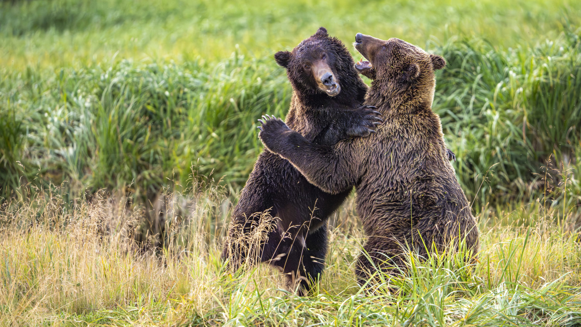 Auf unserer Reise zu den Grizzly’s durften wir diese zwei Bären, im schwindenden Licht, über einen längeren Zeitraum aus nächster Nähe bei ihrem imposanten Scheinkampf beobachten! Mit einer erstaunlichen Ausdauer kämpften die beiden Braunen und begeisterten uns. Ihre Waffen, Krallen und Zähne setzten sie immer mit Bedacht ein! Sie zeigten uns aber eindrücklich was es heissen würde, zwischen ihre Pranken zu kommen!